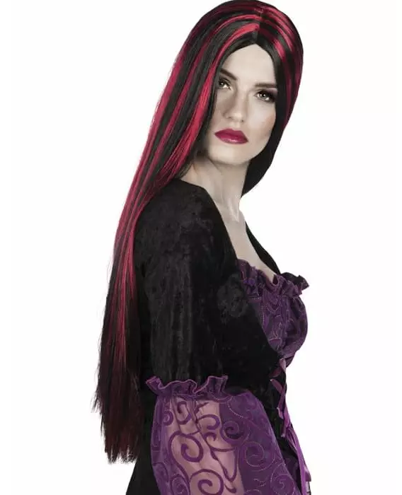 Ha vakkert hår! Denne parykken for kvinner er svart med røde striper. Håret er langt og måler omtrent 70 cm. Denne lange parykken vil være perfekt for å fullføre et heksekostyme til Halloween. Inkludert tilbehør: Parykkmateriale: 100 % polyester 100 % polyester