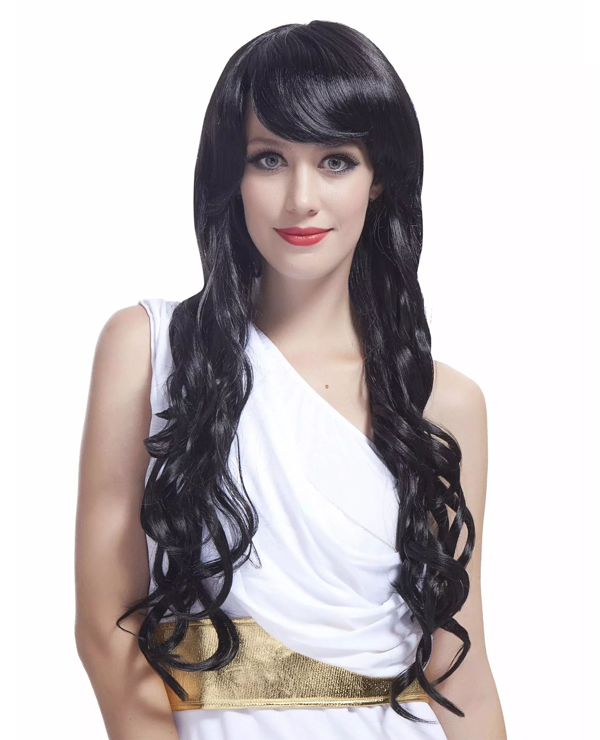 Glans og veldefinerte krøller! Denne glamorøse parykken for kvinner er svart og faller nedenfor brystet. Panneluggen og de perfekt definerte krøllene vil gi et glamorøst preg til kostymet ditt. Den vil være det ideelle komplementet til kostymet ditt under kostymefester, til et show eller til og med til Halloween. Inkludert tilbehør: Parykk Materiale: Syntetisk 100 % polyester 100 % polyester