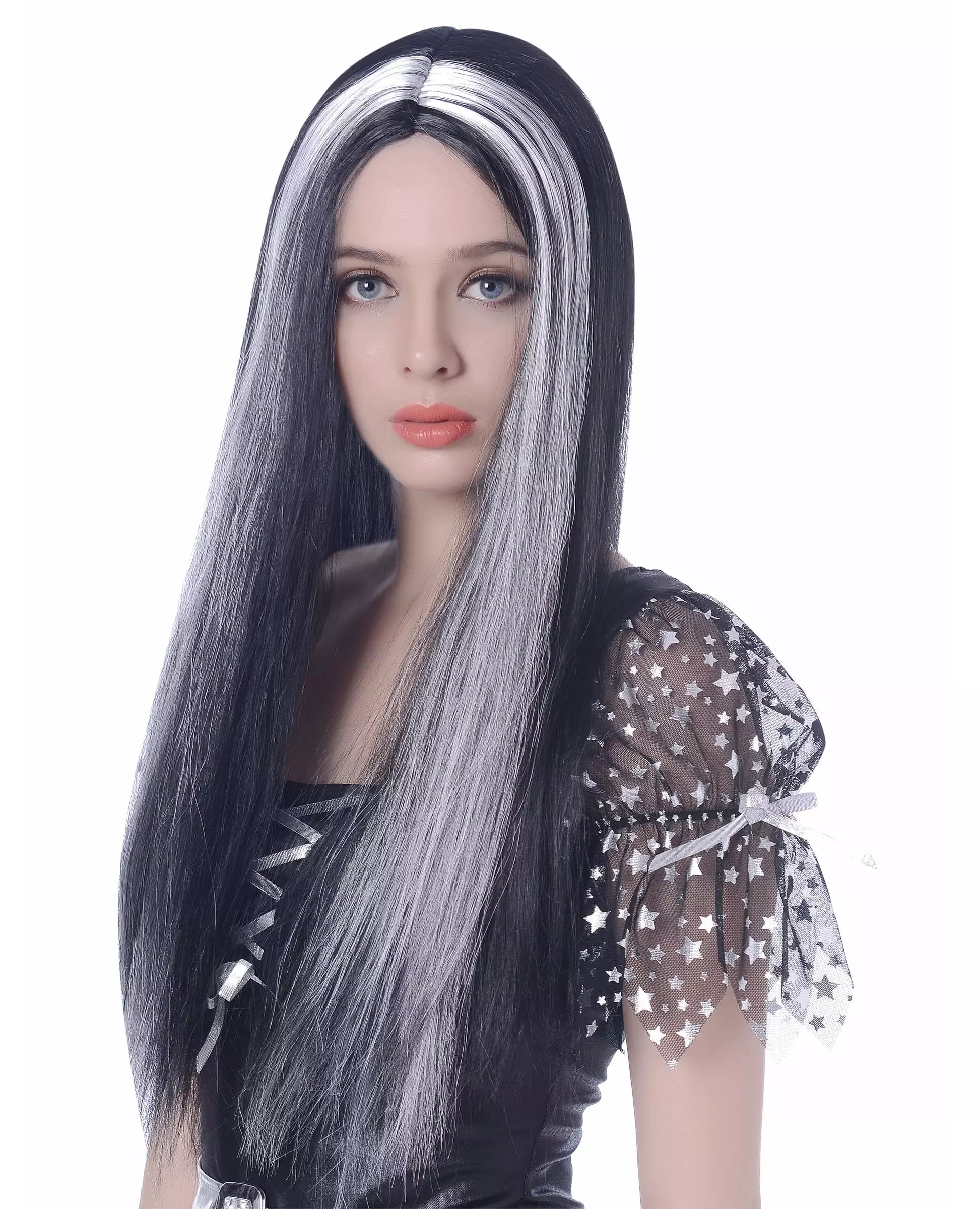 Få en ny klipp! Denne parykken er for kvinner. Det svart-hvite håret er rett og langt. Denne parykken vil være perfekt for å fullføre antrekket ditt til Halloween eller en temafest. Inkludert tilbehør: Parykkmateriale: Syntetisk 100 % polyester 100 % polyester