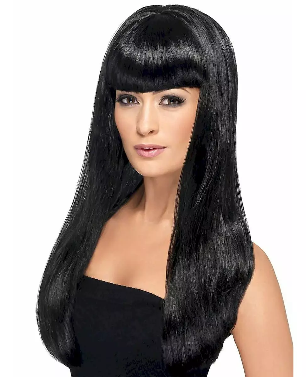 Glamorøs! Denne lange, svarte parykken for kvinner har pannelugg. En moderne klipp og rett hår er essensielt. Den vil være ideell for å gi alle slags kostymer et glamorøst preg under kostyme- eller temafester! Inkludert tilbehør: En parykk. Materiale: Syntetisk.