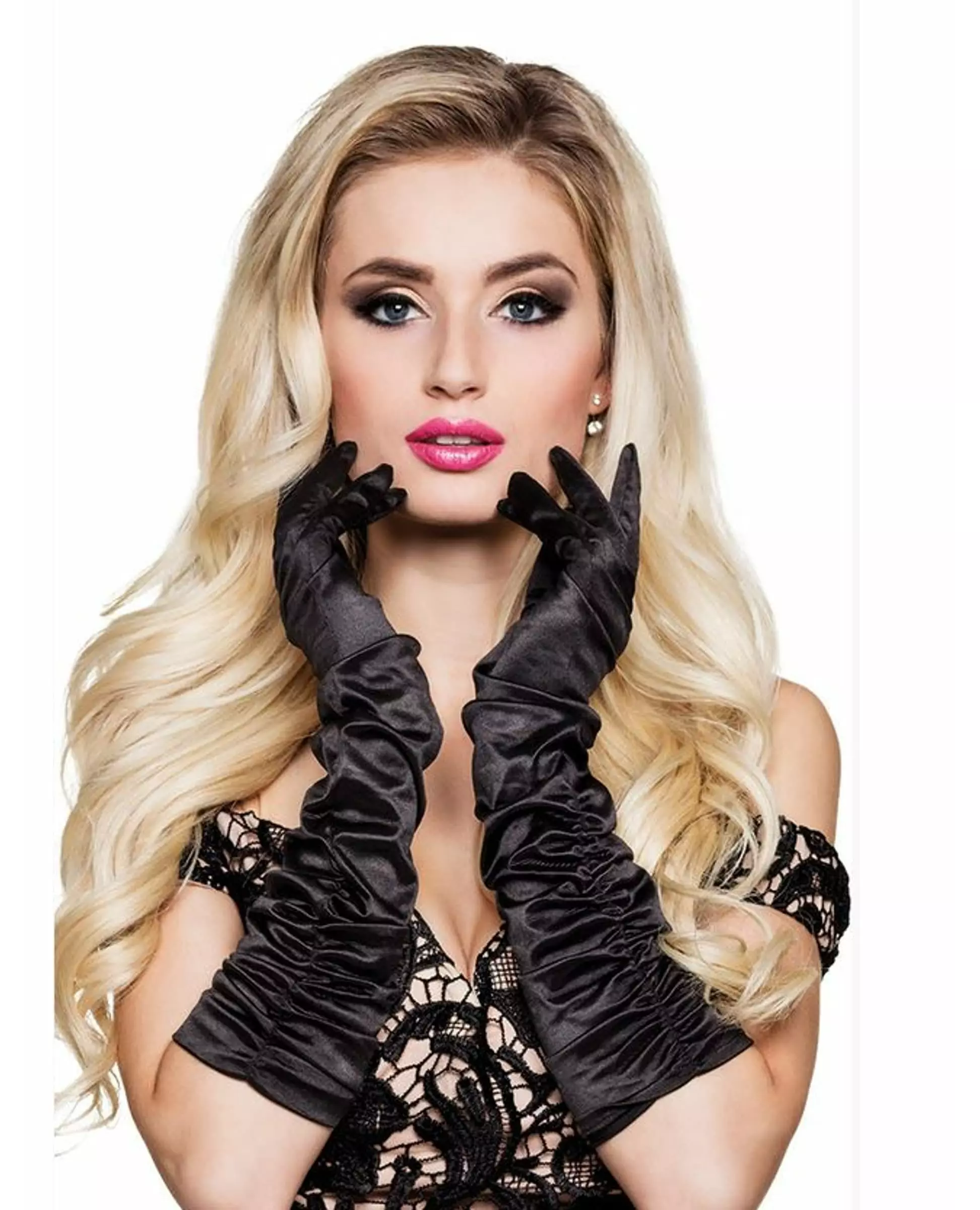 Forvandle deg til en femme fatale med disse lange, svarte hanskene. Disse lange satenghanskene for voksne er svarte. De er plisserte på sidene og måler omtrent 50 cm i lengde. Disse lange, svarte hanskene vil være perfekte for å fullføre et glamorøst antrekk med klasse under en kabaretkveld. Inkludert tilbehør: 2 hansker. Materiale: 100 % polyester. 100 % polyester.