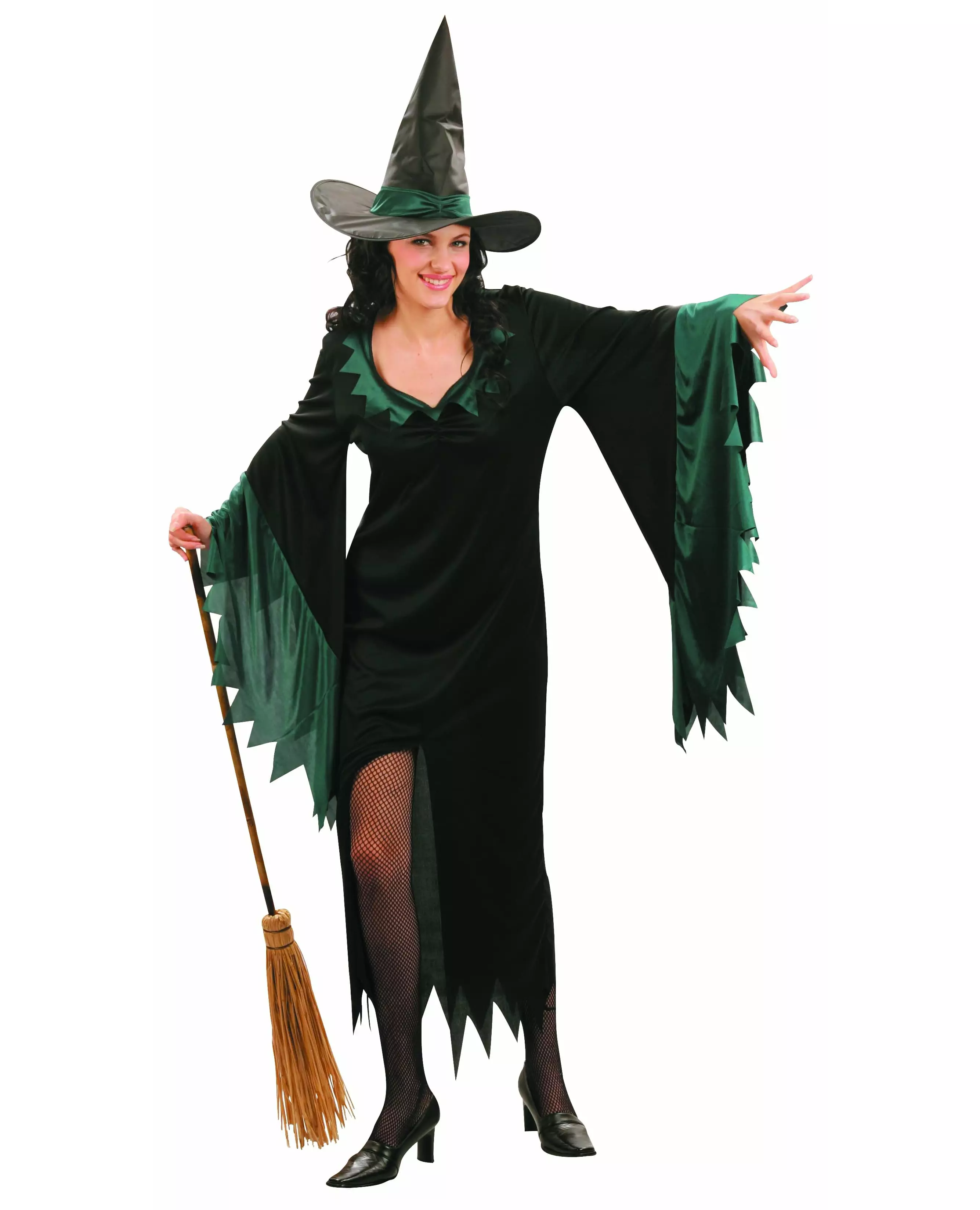 Hatt inkludert! Dette Halloween-heksekostymet for kvinner inkluderer en kjole og en svart hatt. Kjolen er løs og har en splitt over kneet. Ermene er utsvingte. Grønne hakk pryder kostymet på ermene, kragen og et bånd i samme farge rundt bunnen av hatten. Dette kostymet er perfekt for kostymefester eller Halloween. Vær mer skremmende enn noensinne. Tilbehør inkludert: Kleshatt Materiale: 100 % polyester Pleie: Håndvask