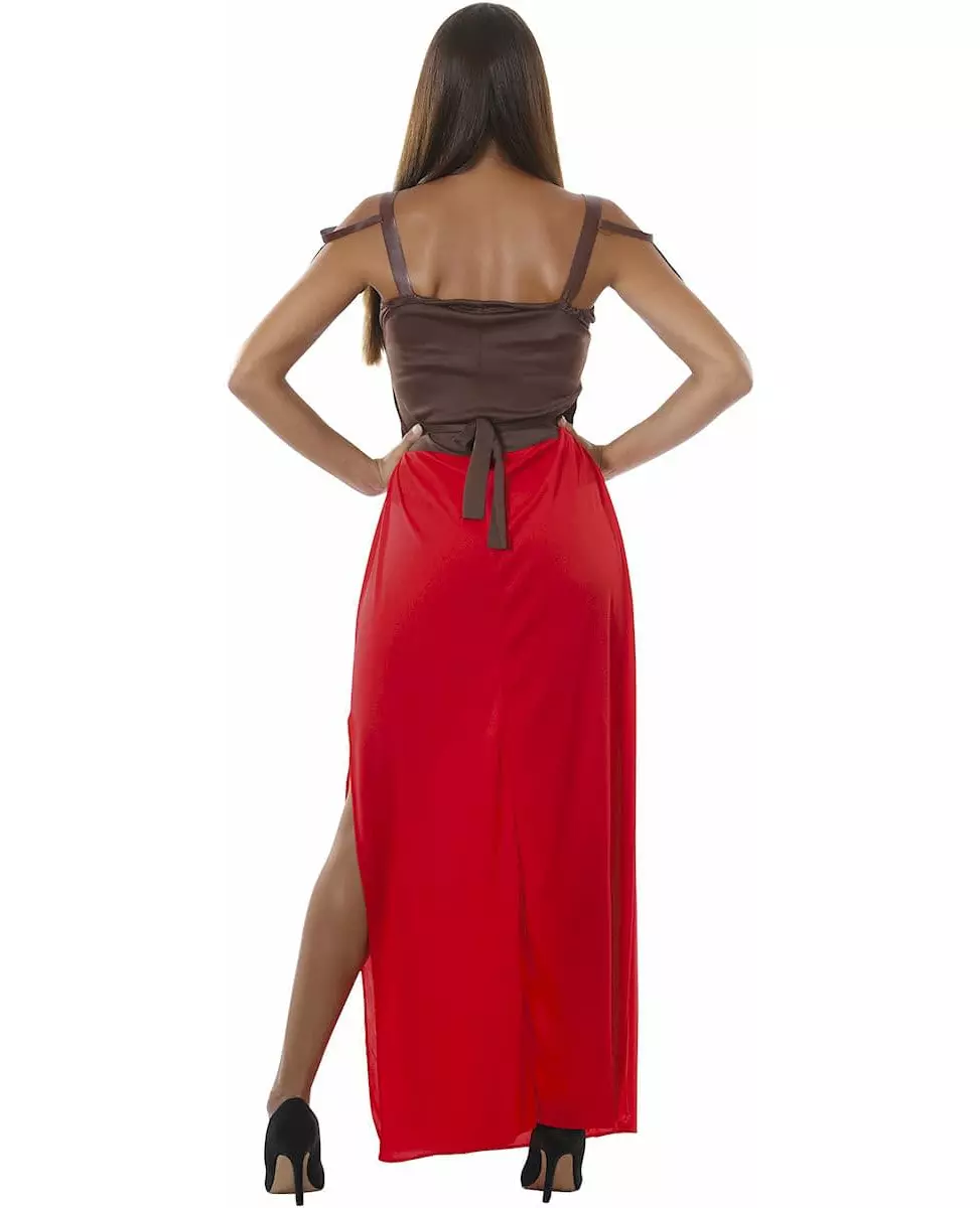 En vakker kriger! Dette gladiatorkrigerkostymet er for kvinner og inkluderer en flott kjole laget av en brun bustier-del med fløyelsfølelse og et gulltrykk rett foran. Bakdelen er laget av mykt stoff med strikk. To bånd på sidene lar deg stramme det hele etter kroppsfasongen din. Stroppene imiterer perfekt frynsede lærreimer. Det samme gjelder skjørtdelen, hvor de brune frynsene med et gullvåpenskjold matcher perfekt det lange, knallrøde slep. (sko og smykker er ikke inkludert). Dette kostymet tilbys deg i en størrelse som passer en 42/44. Dette svært elegante kostymet vil gjøre deg til en fantastisk gladiator for et kostymearrangement som karneval. Inkludert tilbehør: Kjole Materiale: 100 % polyester Stell: Håndvaskbar