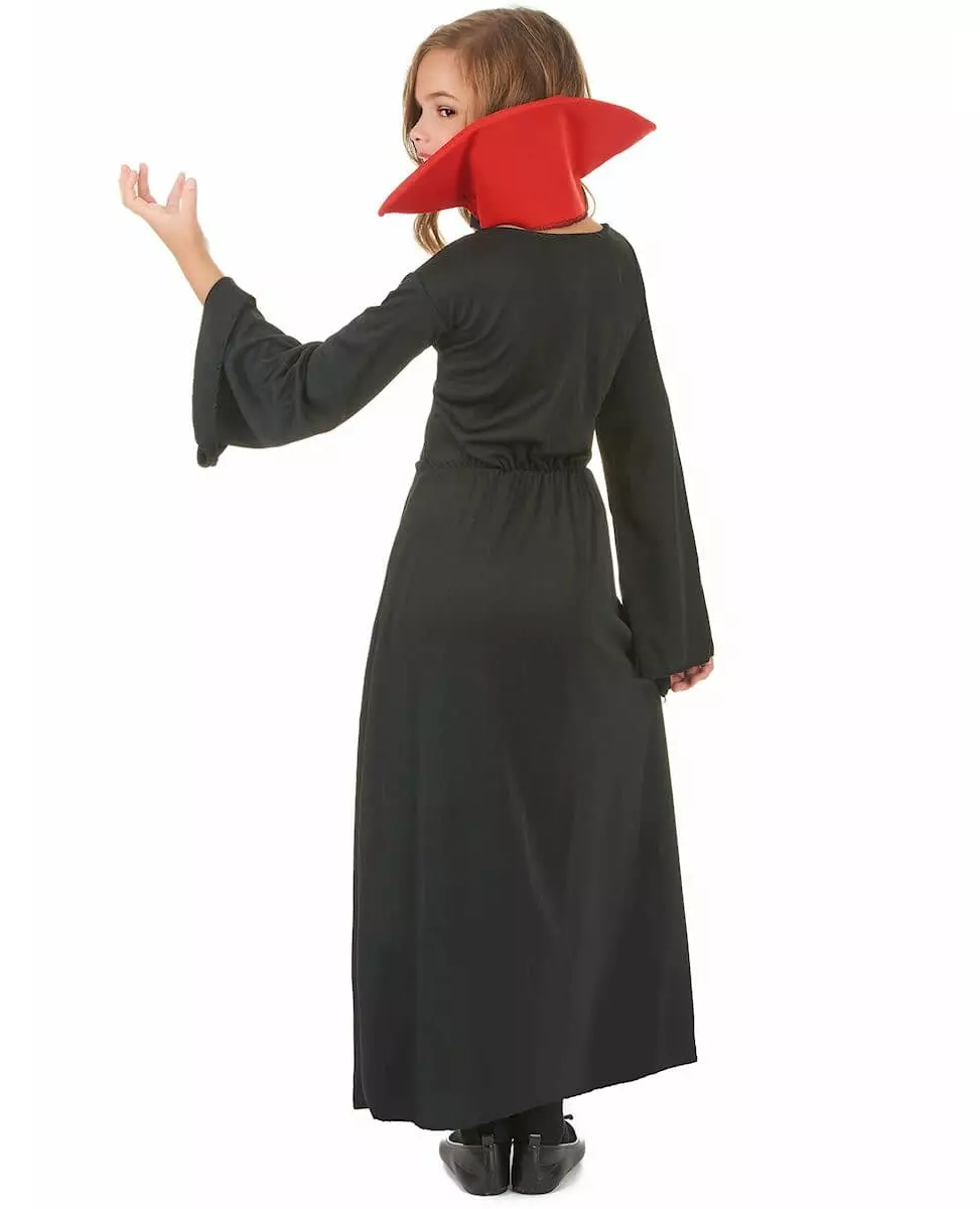 Med utsvingte ermer! Dette Halloween-vampyrkostymet for jenter består av en rød og svart elastisk kjole med lange utsvingte ermer og en falsk overdel. Antrekket inkluderer også en stiv skumkrage som festes under haken med en borrelåsstropp hvor en falsk edelsten er festet. Dette kostymet vil være perfekt for Halloween-kvelden eller andre utkledningsarrangementer. Inkludert tilbehør: Kjolekrage Materiale: 100 % polyester Pleie: Håndvask
