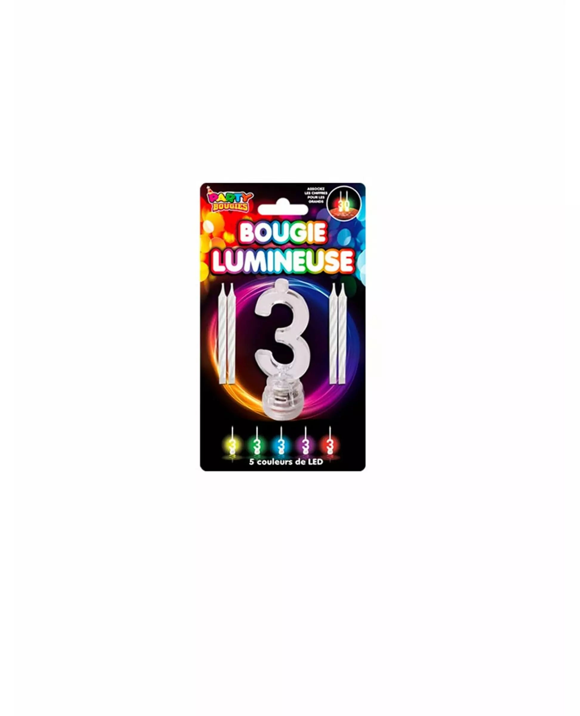 Bursdagskaken din blir strålende! Dette settet består av en plastbase og 4 hvite lys. Basen representerer det gjennomsiktige tallet 3 som lyser med forskjellige LED-farger: grønn, blå, rosa, gul og rød. Den har plass til et lys på toppen. De 4 vokslysene kan enkelt plasseres på basen. Vis alderen din på en lysende måte på bursdagskaken din med disse lysene! Inkludert tilbehør: 1 base med tall 3 4 lys Materiale: Voks, plast