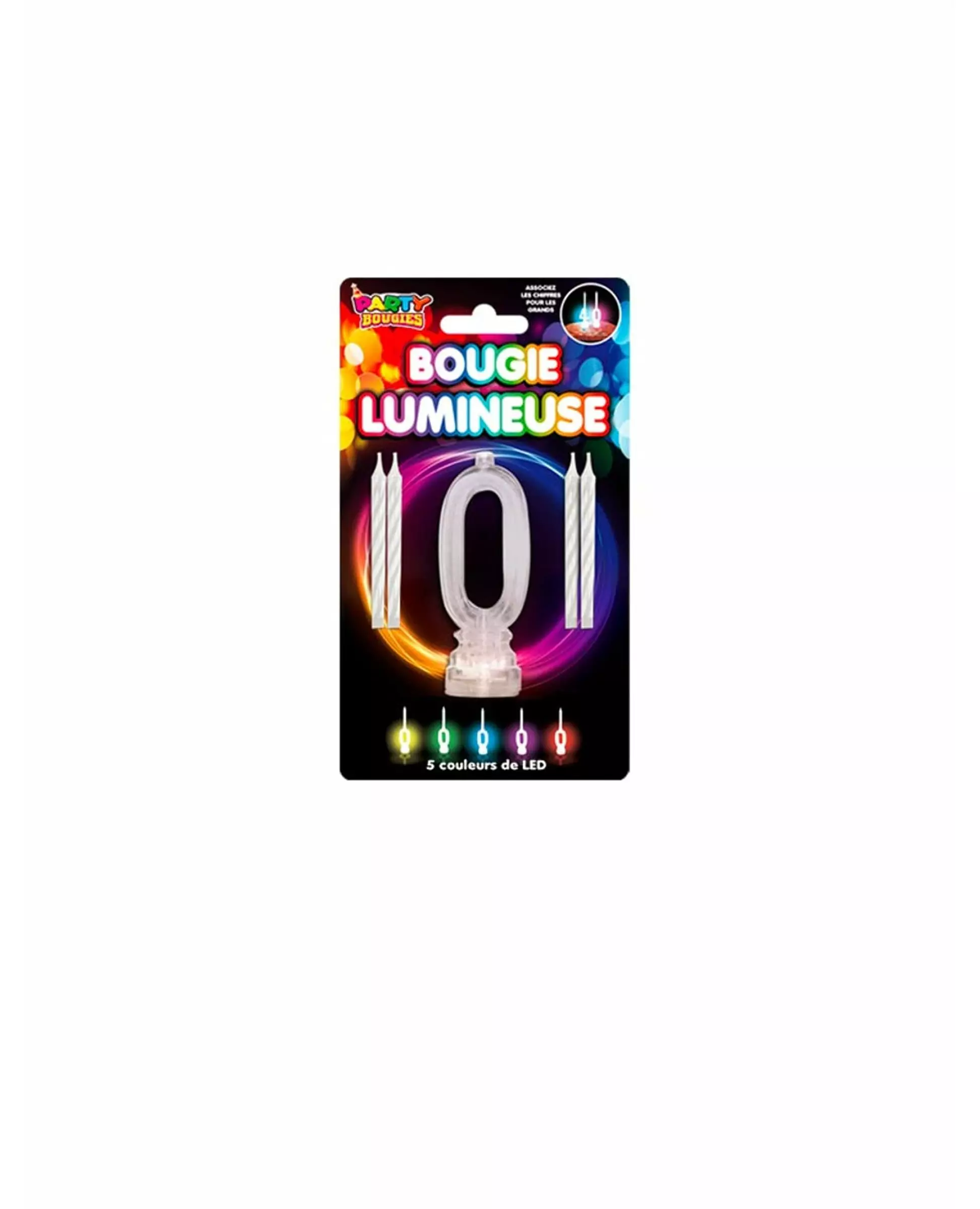 For en lysende bursdag! Dette settet består av 1 lysholder og 4 vokslys. Lysholderen er lyssterk og representerer tallet 0, den kan lyse i 5 forskjellige farger (gul, grønn, blå, rosa og rød). De 4 lysene er klassiske lys som du kan plassere på holderen. Dette lysende lyset vil være ideelt for å gi et originalt preg av farge til bursdagskaken din! Inkludert tilbehør: 1 lysende lys 4 lys Materiale: Voks og plast