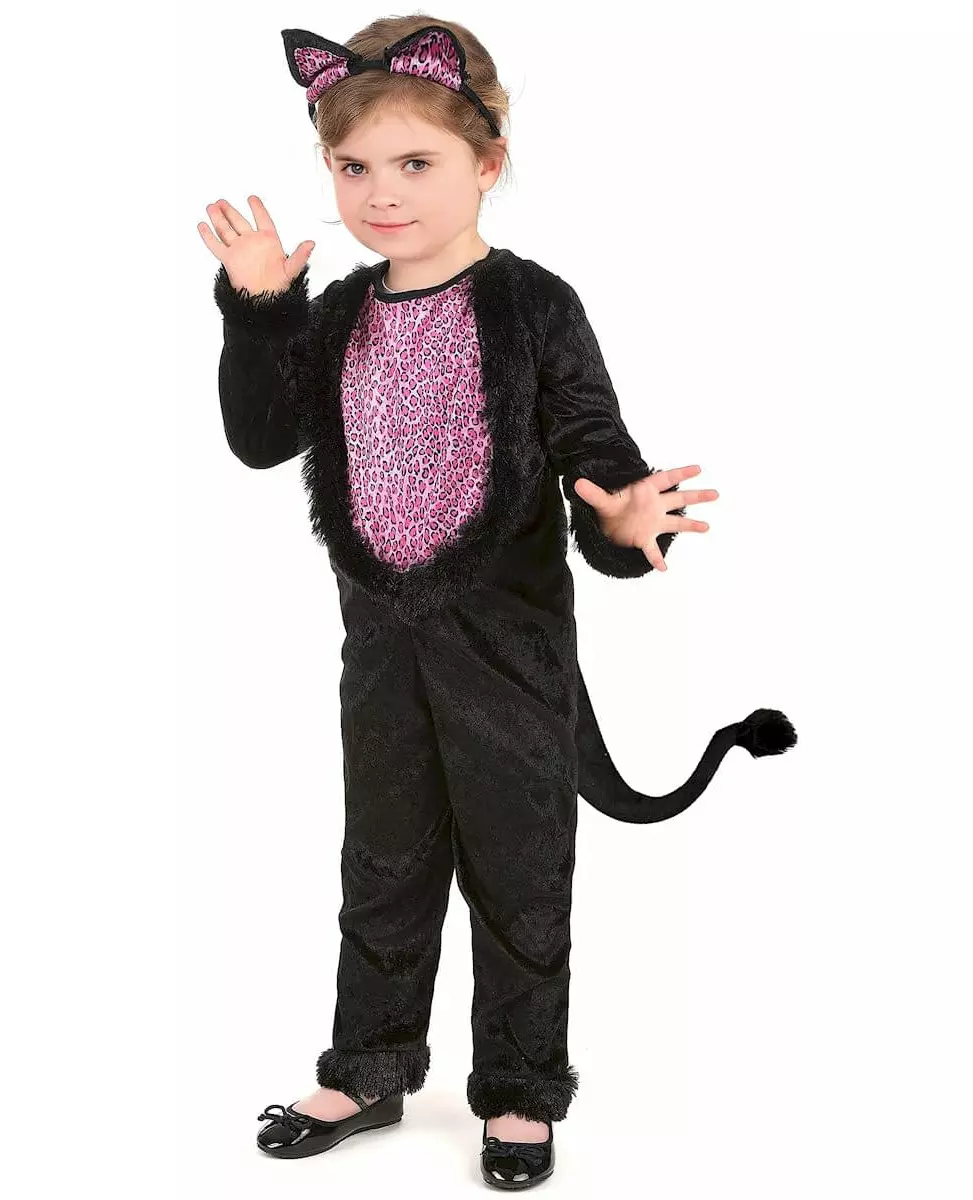 Komplett jumpsuit! Dette søte kattekostymet er for jenter og inkluderer en jumpsuit, et pannebånd og en hale (sko ikke inkludert). Jumpsuiten er laget av svart fløyelsstoff. Den lukkes bak med borrelås. På magen er det et stykke rosa leopardmønster som fremkaller en myk mage. Den er også omgitt av myk fuskepels. Det samme gjelder endene av armer og ben. Pannebåndet er laget av plast med to små svarte ører festet på den ene siden og rosa leopardører på den andre. De kan flyttes på pannebåndet. Til slutt er den lille kattens hale laget av borrelås. Dette lille kattungekostymet vil være ideelt for et danseshow eller et karneval. Inkludert tilbehør: Jumpsuit Hale Pannebånd Materiale: 100 % polyester Vedlikehold: Håndvask