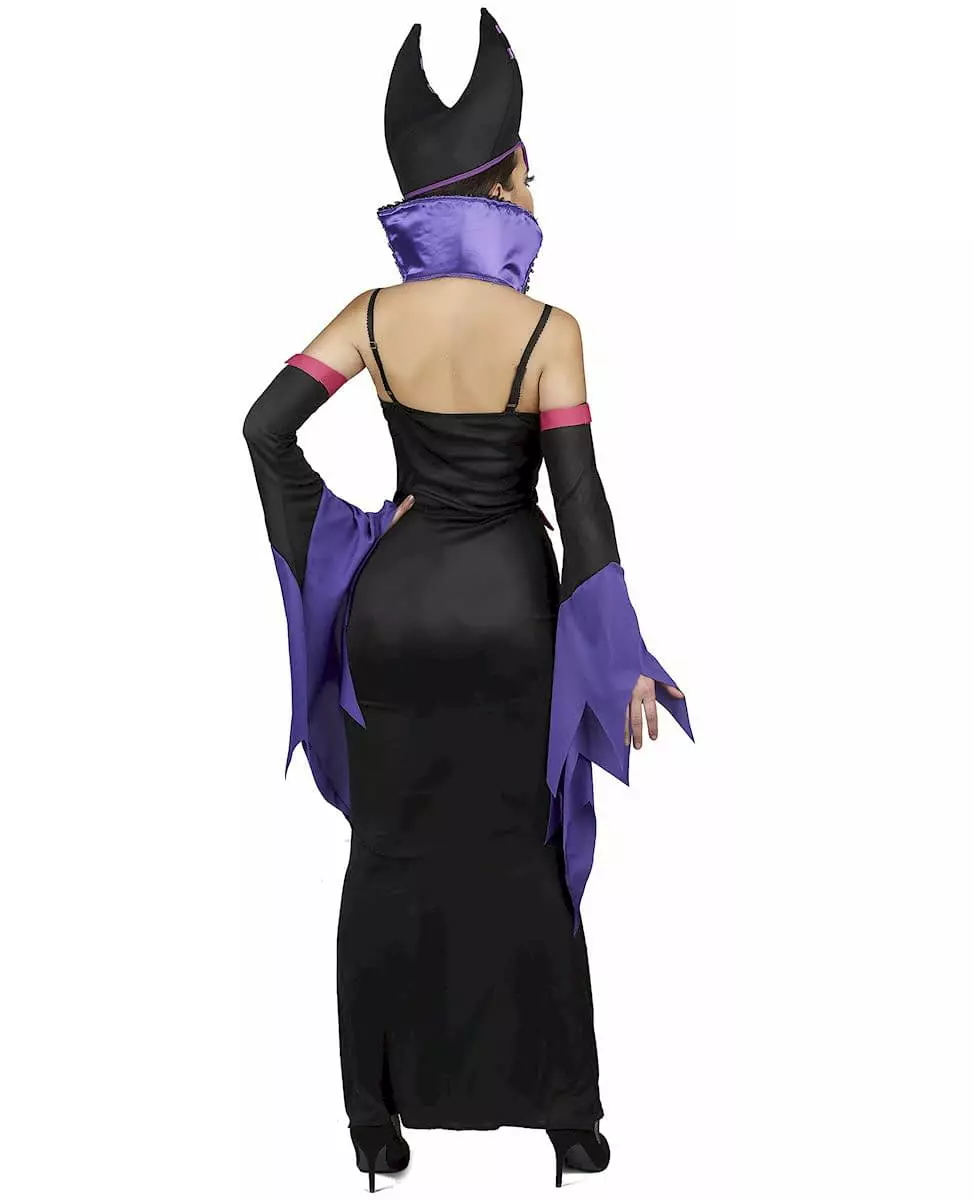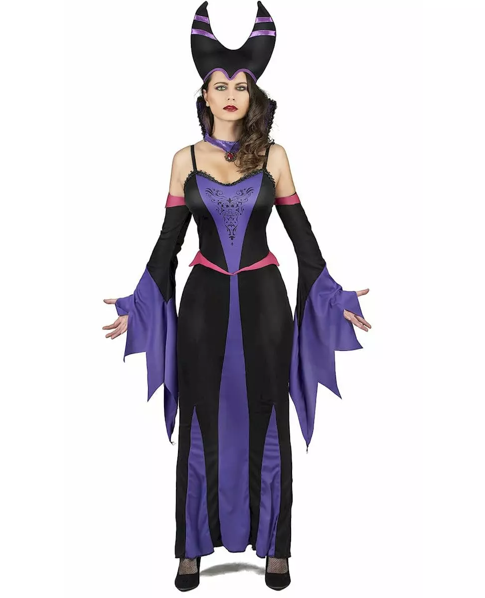 Svart magis trollkvinne Dette onde kostymet for kvinner inkluderer en kjole, to ermer, to armbånd, en krage og et hodeplagg (fiskenett og sko er ikke inkludert). Kjolen i svart og lilla stoff er myk, komfortabel og tettsittende; den utvider seg fra knærne. Stroppene, som ligner på en BH, er justerbare og elastiske. Ermene vil være plassert ved biceps og holdes på plass med elastiske bånd. Denne delen vil være skjult av rosa filtarmbånd (festet med borrelås). Skumkragen dekket med et lilla satengstoff vil ha et supert grep rundt halsen. Den er festet med en ripehalskjede dekorert med en rød perle. Det flotte hodeplagget forestiller to horn med lilla satengbånd. Det vil holde perfekt på hodet ditt takket være den tykke skumteksturen. Du vil være utrolig sexy på Halloween-kvelden med denne trollmannskjolen!. Inkludert tilbehør: Kjole Krage Hodeplagg 2 Mansjetter 2 Armbånd Materiale: 100 % polyester Stell: Håndvaskbar