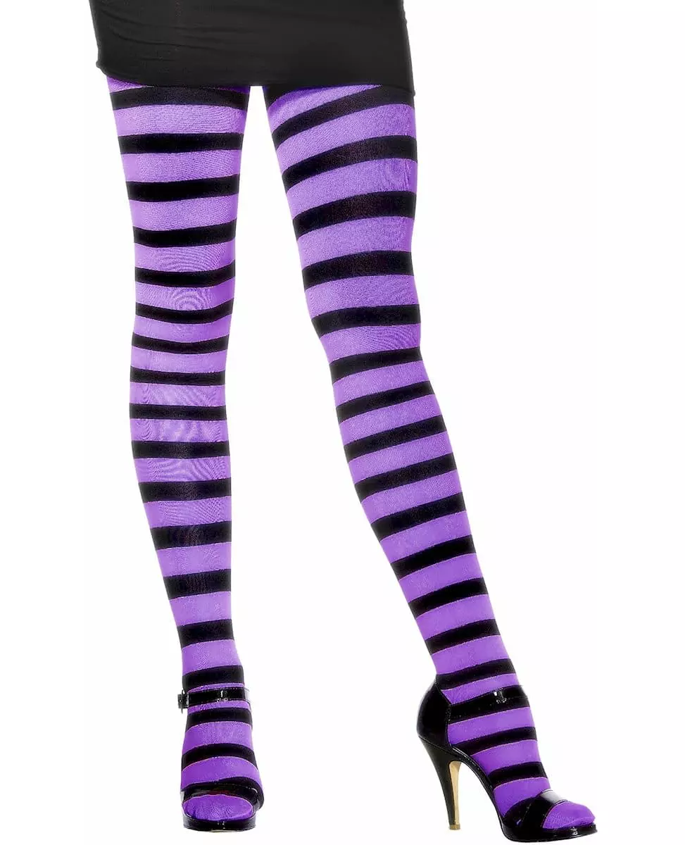 Komfortabelt materiale! Lilla og svartstripete Halloween-strømpebukser for voksne, én størrelse passer alle. Ideell for å fullføre heksekostymet ditt til et show eller til Halloween. Copyright Widmann SRL.