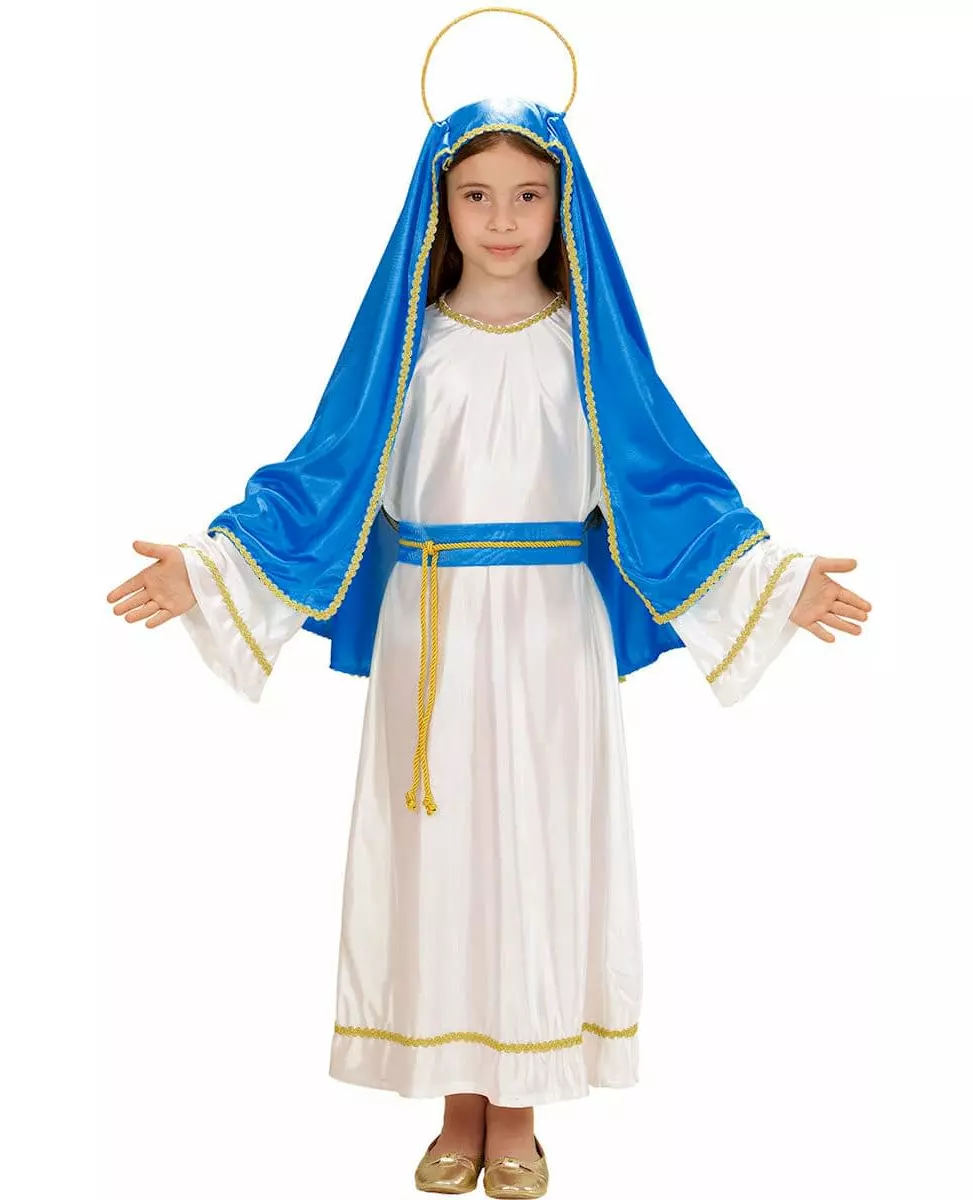 Lag din egen julekrybbe. Dette Maria-kostymet for jenter består av en kjole, et slør og et belte (sko ikke inkludert). Den lange kjolen er hvit i satengstoff. Den er dekorert med gullflettet stoff. Denne hvite kjolen lukkes bak med glidelås. Det blå satengsløret er foret med gullflettet stoff. Den er utstyrt med en skinnende glorie. Denne glorien er laget av en bred metalltråd som du kan forme slik du ønsker. Til slutt fullfører et belte Maria-kostymet. Dette beltet er blått med en gullsnor. Det knytes rundt livet. Dette Maria-kostymet vil være perfekt for å lage en ekte liten julekrybbe.   ©copy; Copyright Widmann SRL. Inkludert tilbehør: Kjole, slør med glorie, belte Materiale: 100 % polyester Vedlikehold: Håndvask
