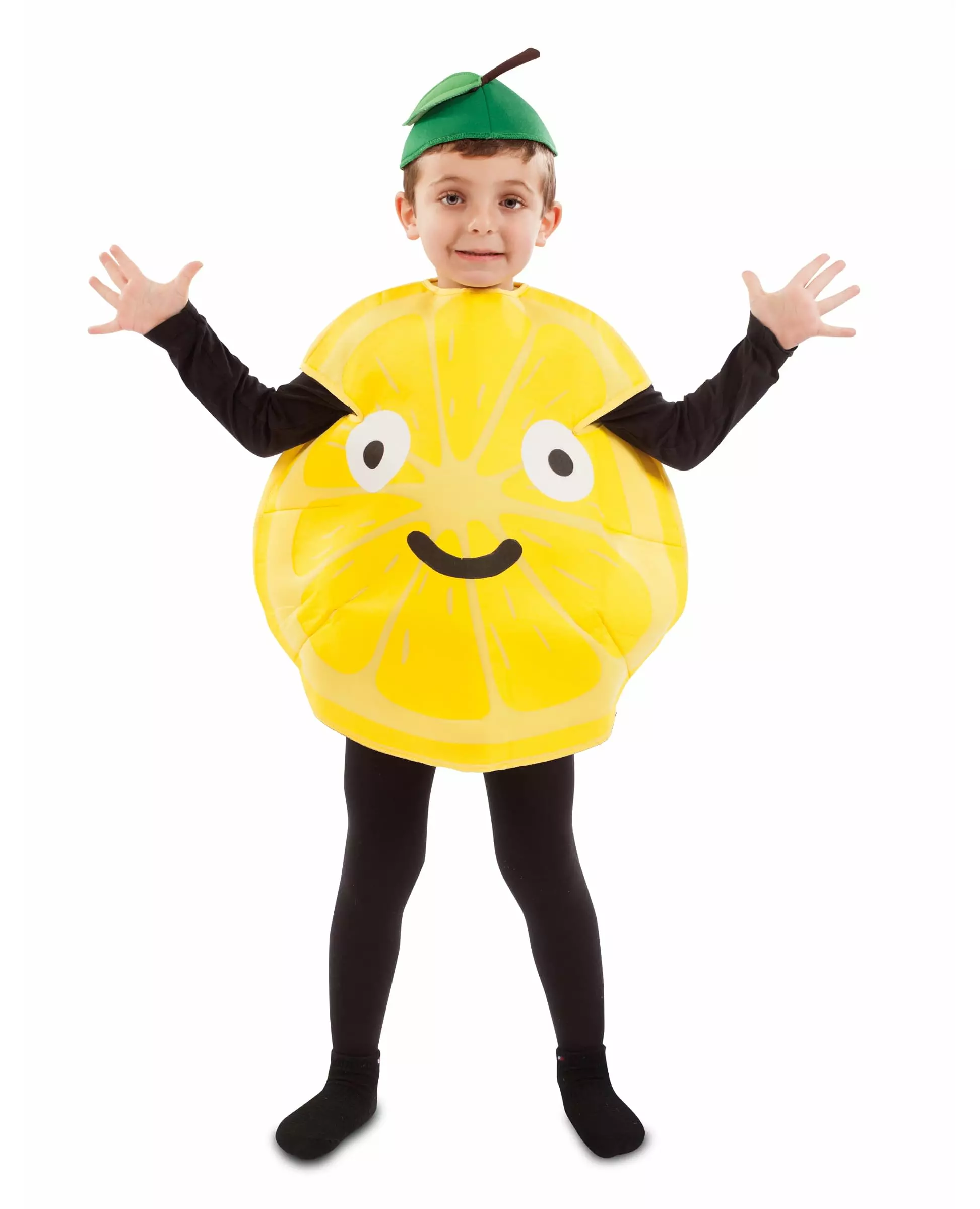 Lek pressede sitroner til karneval i dette kostymet. Dette sitronkostymet for barn består av en tunika og en hatt (svart topp og bukser er ikke inkludert). Tunikaen er rund og gul. Den er trykt med sitronsegmenter, som om den var delt i to. Vi ser også små runde øyne og et smil tegnet på forsiden. Hatten er grønn, med et blad sydd på. Dette kostymet vil være perfekt for å live opp kostymefester!. Inkludert tilbehør: Tunikahatt Materiale: 100 % polyester Vedlikehold: Håndvask.