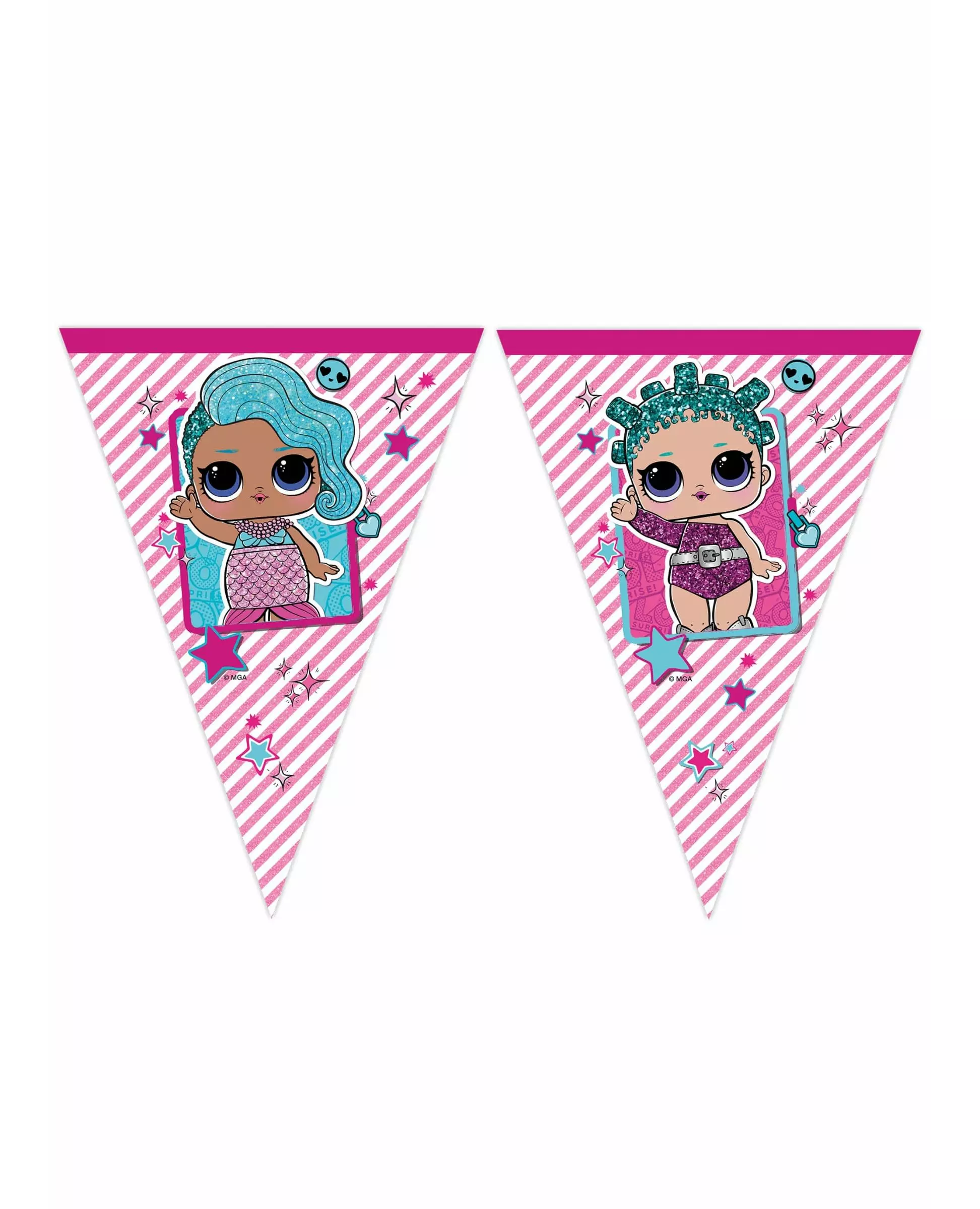 Lag en dekorasjon med LOL Surprise™! Denne girlanderen måler omtrent 2,3 m og er offisielt lisensiert av LOL Surprise™. Den har 9 vimpler trykt med LOL Surprise-dukker i nyanser av rosa og turkis. Lag den perfekte LOL Surprise-bursdagsdekorasjonen med denne girlanderen!. Inkludert tilbehør: 1 girlander Materiale: Plast