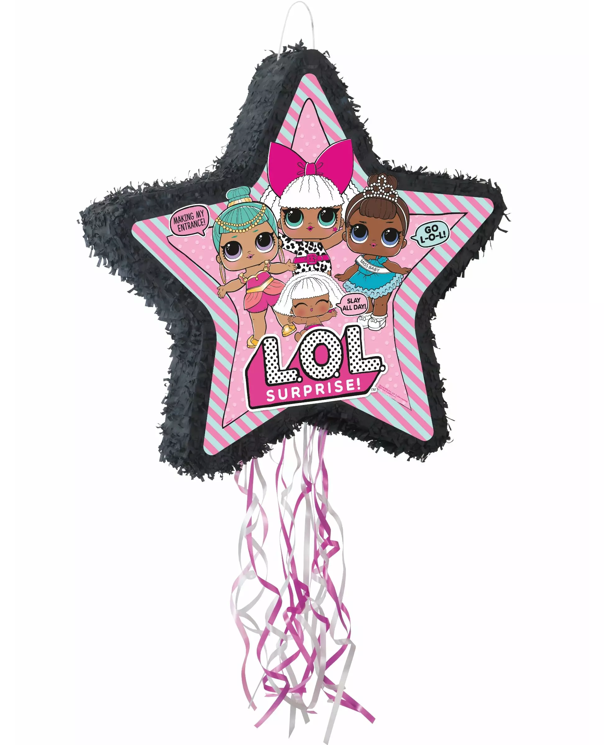 En pen piñata for en veldig morsom aktivitet! Denne fantastiske piñataen er offisielt lisensiert av Lol Surprise™. Laget av papp, er den stjerneformet og måler omtrent 57 x 55 cm. Den er dekket med svarte papirfrynser samt et trykk som forestiller Lol Surprise™-dukkene. For å leke, fyll piñataen din med godbiter og små overraskelser; heng den i håndtaket på toppen; bind for øynene dine med en piñatamaske og slå den med en pinne. Piñata til den går i stykker og slipper ut innholdet. De små kan ganske enkelt bytte på å trekke i snorene under piñataen til de finner den som åpner den. Denne piñataen vil være den ideelle underholdningen til datterens bursdag! Unik festlogo. Inkludert tilbehør: 1 piñata. Materiale: Papp, papir.