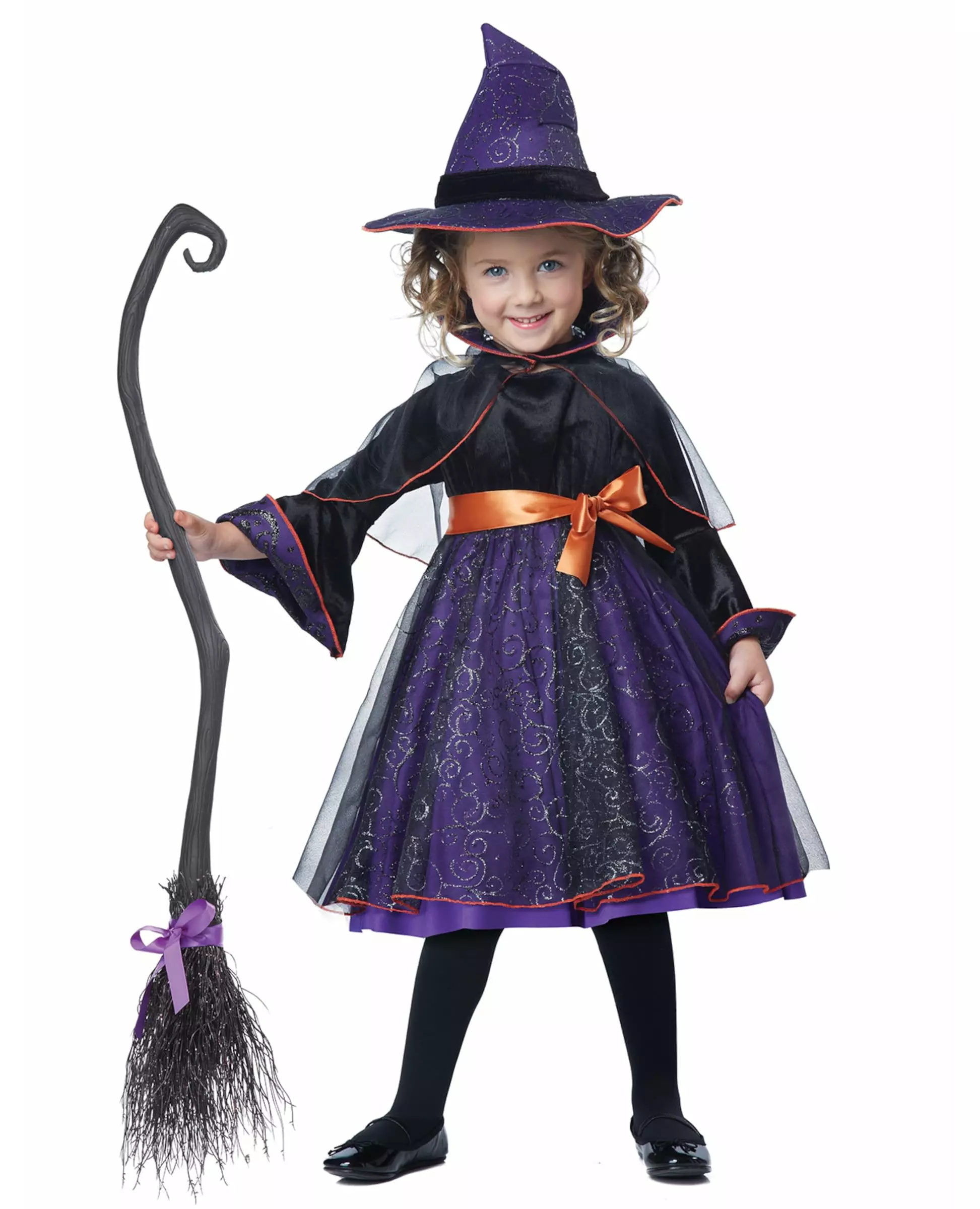 Abrakadabra! Dette abrakadabra-heksekostymet består av en kjole, en kappe, et belte og en hatt (strømpebukser, sko og kost er ikke inkludert). Kjolen er svart og lilla med lange ermer. Toppen er svart med fløyelseffekt, og ermene er bredere ved håndleddene. Mansjettene er lilla med svarte paljettmønstre. Nederdelen av kjolen er lilla og har et gjennomsiktig svart slør med samme design som ermene. Det oransje beltet vil gi et preg av farge. Den spisse hatten er lilla med svarte, skinnende mønstre og har en oransje kant rundt kanten. Den er dekorert med et svart, fløyelslignende bånd. Til slutt består kostymet av en gjennomsiktig kappe med en oransje kant. Datteren din vil legemliggjøre en søt heks til Halloween med dette abrakadabra-heksekostymet! Materiale: 100 % polyester. Inkludert tilbehør: Kjole, kappe, hatt, belte, pleie: Håndvask