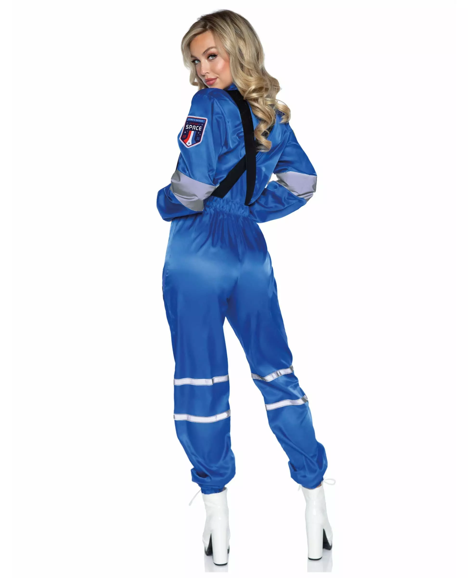 En astronaut klar for oppdraget sitt Dette luksuriøse astronautkostymet er for kvinner og inkluderer en jumpsuit med seler. Nylonjumpsuiten har glidelås foran. Den er blå i fargen med reflekterende striper på albuer, knær og lommer. Et romfartsselskapslogo og landets flagg er vist på ermene og bena. Midjen er elastikk for å stramme jumpsuiten, og de elastiske stroppene som er krysset bak gir et vakkert preg på dette kostymet. Dette luksuriøse astronautkostymet vil være ideelt for å legemliggjøre disse romheltene under en kveld med temaet yrker og uniformer. Inkludert tilbehør: Jumpsuit med seler Materiale: 100 % nylonstoff Pleie: Håndvask