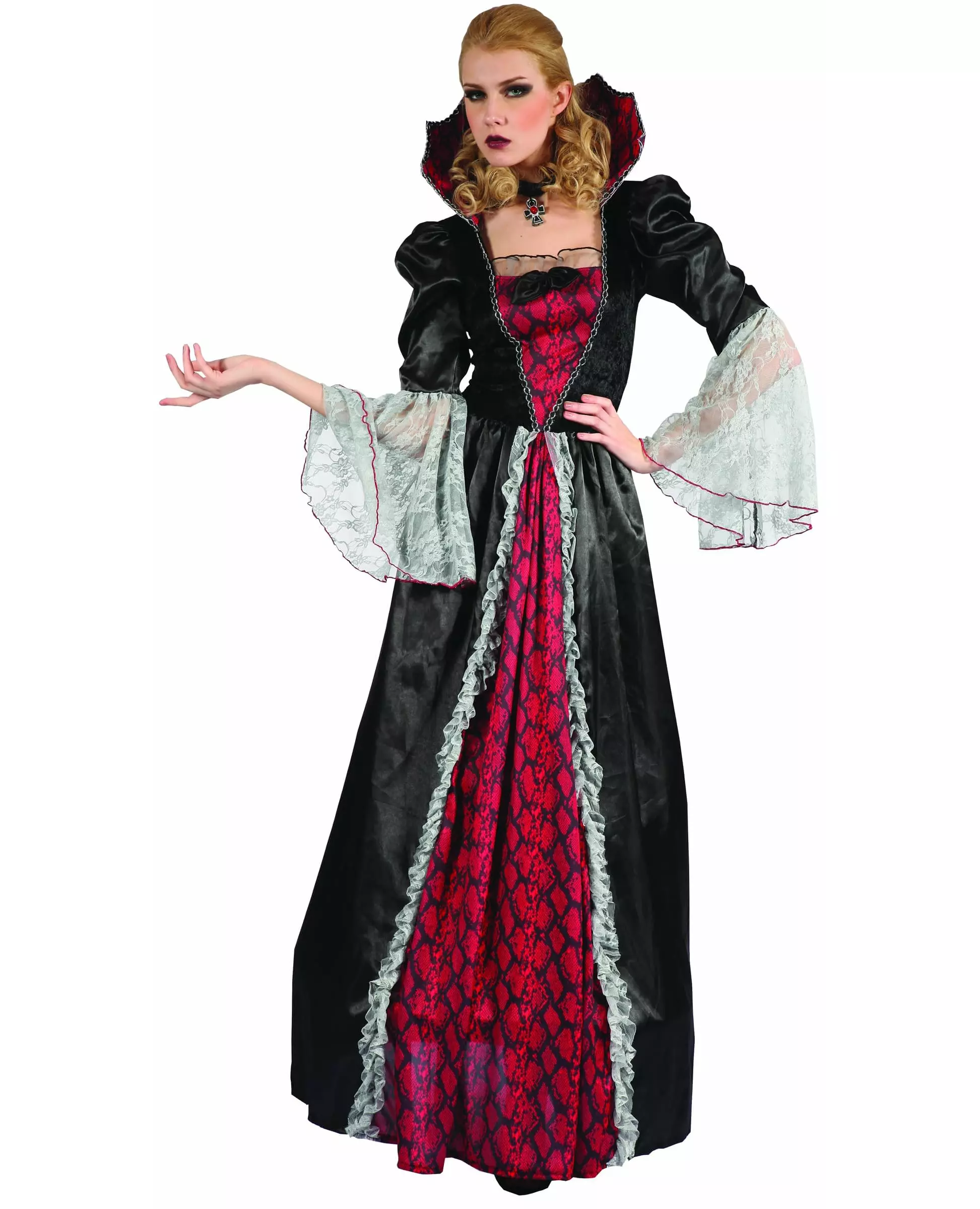 Forvandle deg til en legendarisk skapning! Dette luksuriøse vampyrkostymet for kvinner består av en kjole og et halskjede. Den omtrent 150/154 cm lange kjolen er laget av rødt slangetrykkstoff dekket med svart satengstoff. De utsvingte ermene med blondeeffekt er grå. En bøyle, kortere enn kjolen, er til stede for maksimal volum. Kjolens krage er stiv, slik at du kan holde den rett uten problemer. Chokeren er svart med et korsformet anheng besatt med imiterte røde rubiner. Den festes enkelt med borrelås. Dette luksuriøse vampyrkostymet fra 1800-tallet for kvinner vil være perfekt for å spille vampyr til Halloween eller til en kostymefest med skrekktema. Inkludert tilbehør: Kjole Halskjede Materiale: 100 % polyester Vedlikehold: Håndvask