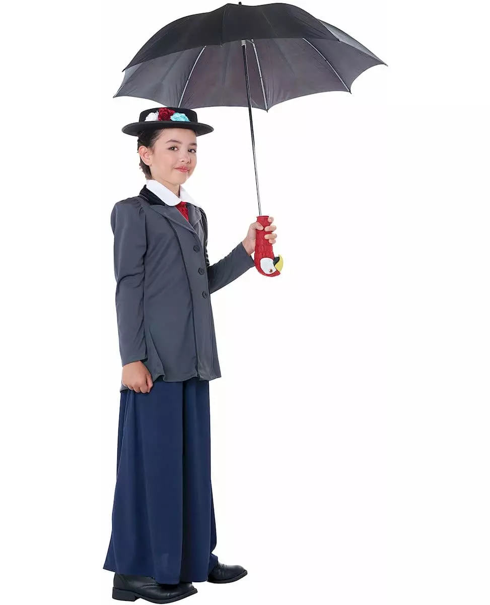 En engelsk barnepike med mer enn ett triks i ermet! Dette engelske barnepikekostymet er for barn. Det består av en jakke, et skjørt, en hatt, en skjortekrage, et slips, tre falske blomster og et paraplyhåndtak (paraply og sko er ikke inkludert). Skjørtet er langt, og jakken er utsmykket med svarte detaljer. Sistnevnte kompletteres med en hvit skjortekrage og et rødt slips. Når det gjelder tilbehør, er hatten svart, og de tre røde, blå og hvite blomstene dekorerer den. Til slutt er paraplyhåndtaket lagt til for mer realisme! For å legemliggjøre den mest berømte av engelske barnepiker, vil dette komplette kostymet være ideelt for en karaktertema-utkledningsfest! Materiale: 100 % polyester. Inkludert tilbehør: Jakke, skjørt, hatt med blomster, paraplyhåndtak, skjortekrage, slips. Stell: Håndvask.