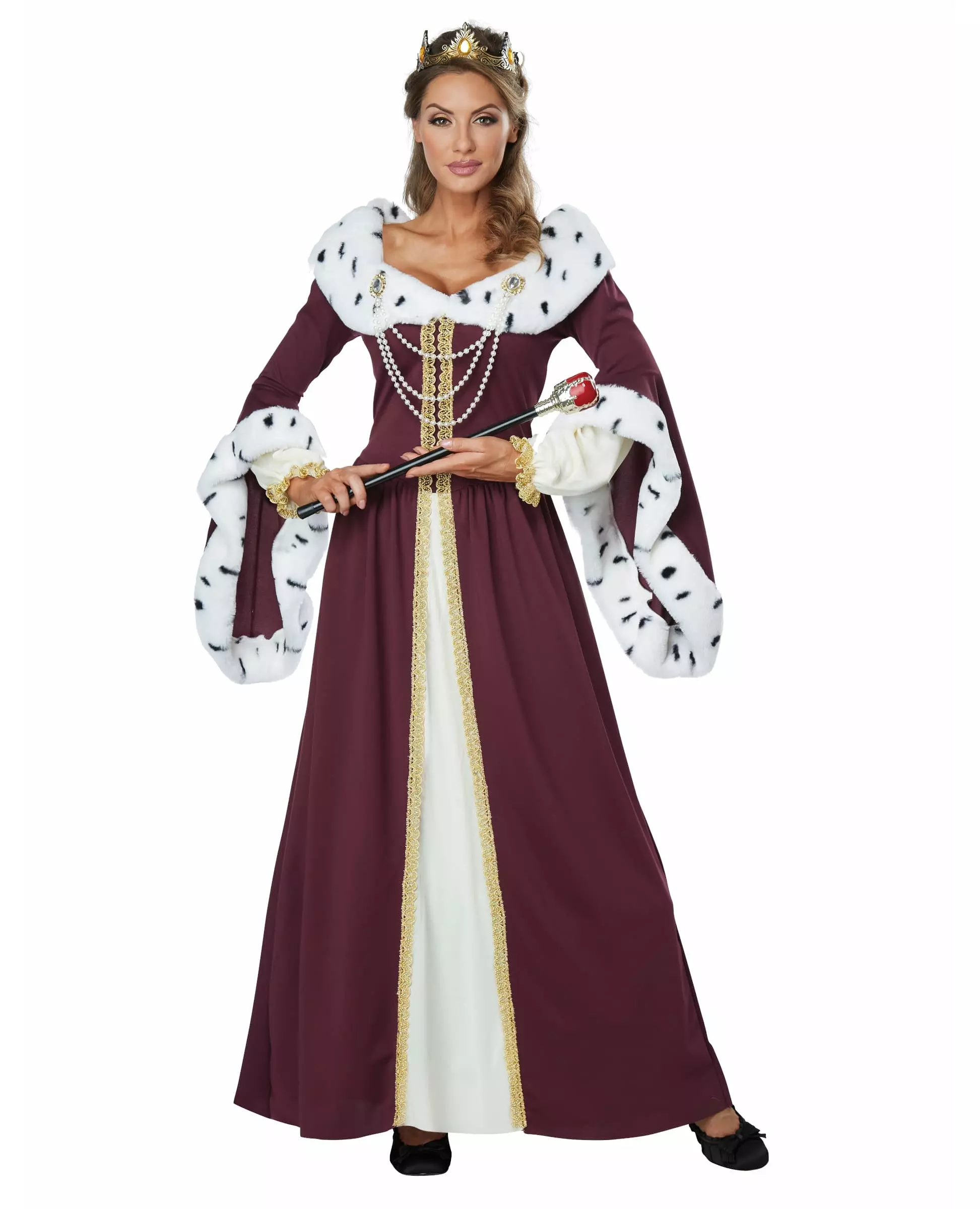 En dronning i all sin prakt. Dette eventyrdronningkostymet for kvinner inkluderer en kjole og en krone (septer ikke inkludert). Dronningens krone er gullfarget med vakre rhinstener i fargen rav. Kjolen er lang. Den er burgunderfarget. Gulldetaljer og imiterte perler dekorerer bysten på denne pene kjolen. Og for enda mer sjarm er det en hvit fuskepels med svarte flekker på brystet og mansjetten på de lange pagodeermene. Dette middelalderdronningkostymet vil være perfekt for en kveld med middelaldertema. Inkludert tilbehør: Kronekjole. Materiale: 100 % polyester. Vedlikehold: Håndvask.