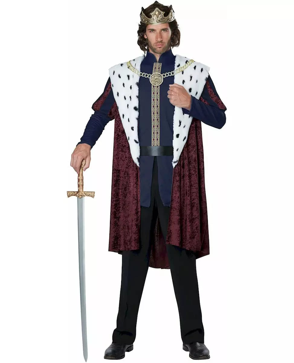 Bli en ekte prins i dette kongelige kostymet. Dette eventyrlige kongekostymet for menn består av en topp, en jakke, en krone, et belte og en medaljong (bukser, sverd og sko er ikke inkludert). Toppen er mørkeblå, med en veldig elegant flette i midten. Den har en liten, litt hevet krage. Jakken er laget av fløyelslignende stoff. Den har korte stripete ermer. For å fremheve den kongelige siden er slaget laget av hvit fuskepels med svarte prikker. Ulike tilbehør fullfører dette kostymet. Først av alt finner vi et svart imitert skinnbelte. En stor medaljong vil bli plassert på skuldrene. Til slutt vil kongens krone etablere din autoritet! Dette komplette kostymet vil være perfekt for å spille ridder i hofte på en middelaldersk kveld. Inkludert tilbehør: Topp Vest Krone Medaljong Belte Materiale: 100 % polyester Vedlikehold: Håndvask