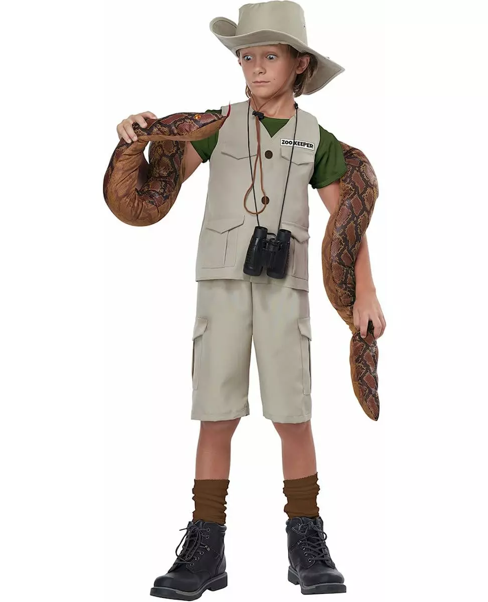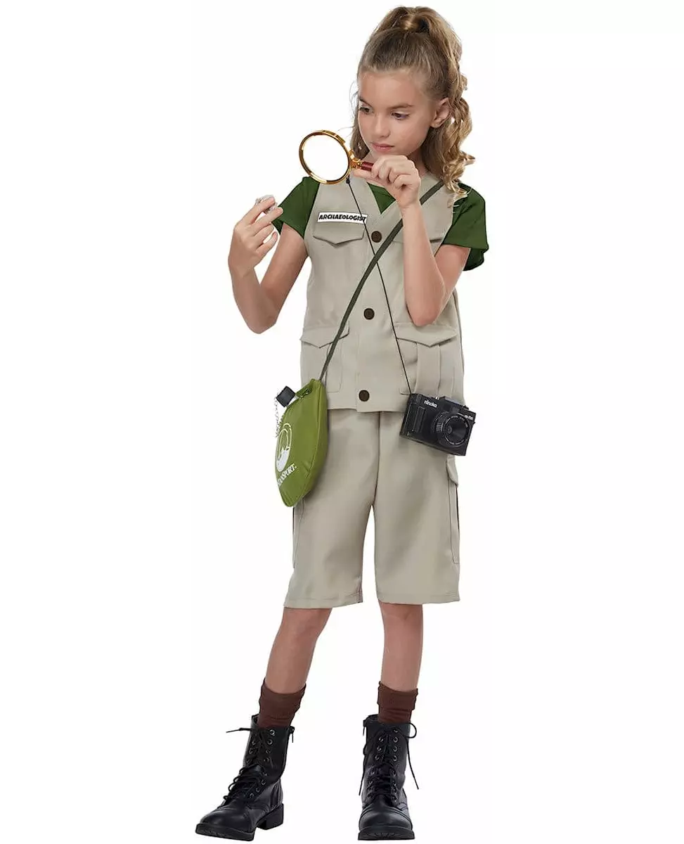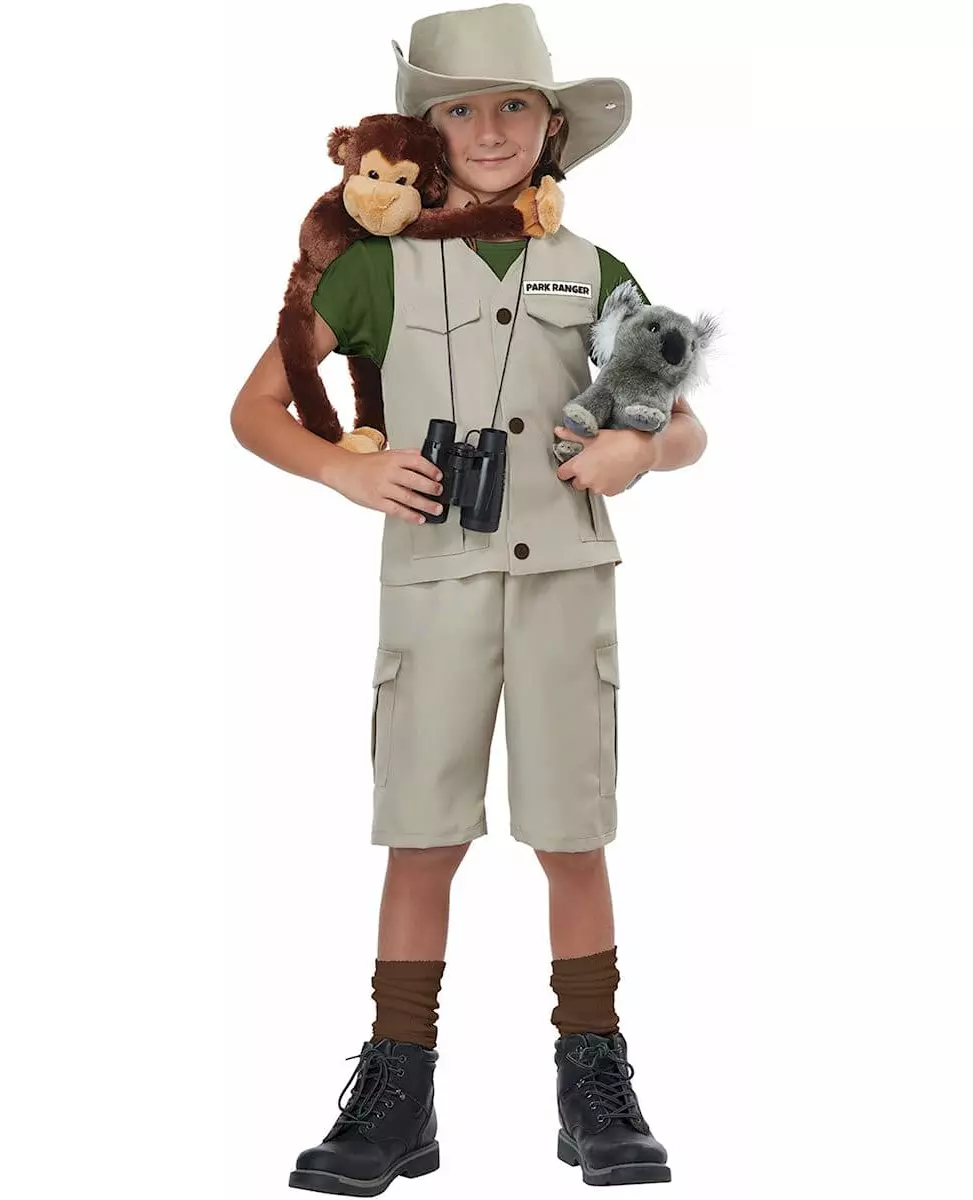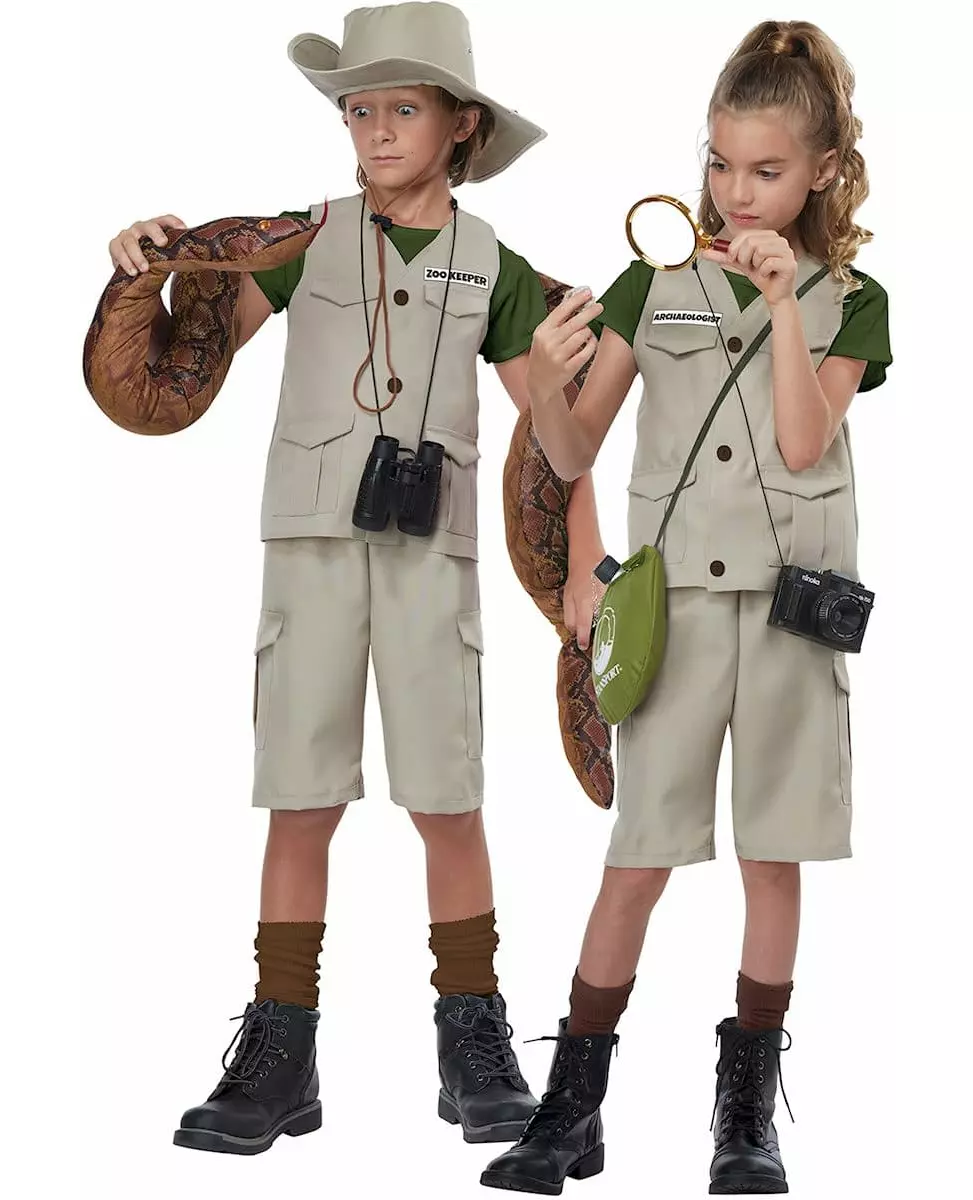En livaktig eventyrer! Dette eventyrkostymet er for barn. Det består av en jakke, en hatt, klistremerker med navnet på et yrke (parkvokter, arkeolog, dyrepasser, viltekspert) og shorts (kosedyr, kikkert, sko og sokker er ikke inkludert). Jakken er helt beige med falske lommer og tre knapper, og en grønn t-skjorte er sydd på jakken. Shortsen har samme farge som jakken, samt sidelommene. Hatten er formet som eventyrer- eller cowboyhatter, med en buet brem. Kikkerten fullfører eventyrerutseendet, mens klistremerkene gir antrekket litt realisme. Forvandle barnet ditt til en ekte eventyrer for en jungeltema-kostymefest. Materiale: 100 % polyester. Inkludert tilbehør: Jakke, shorts, hatt, klistremerker med yrker (parkvokter, arkeolog, dyrepasser, viltekspert). Stell: Håndvask.