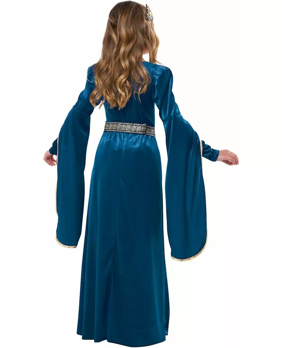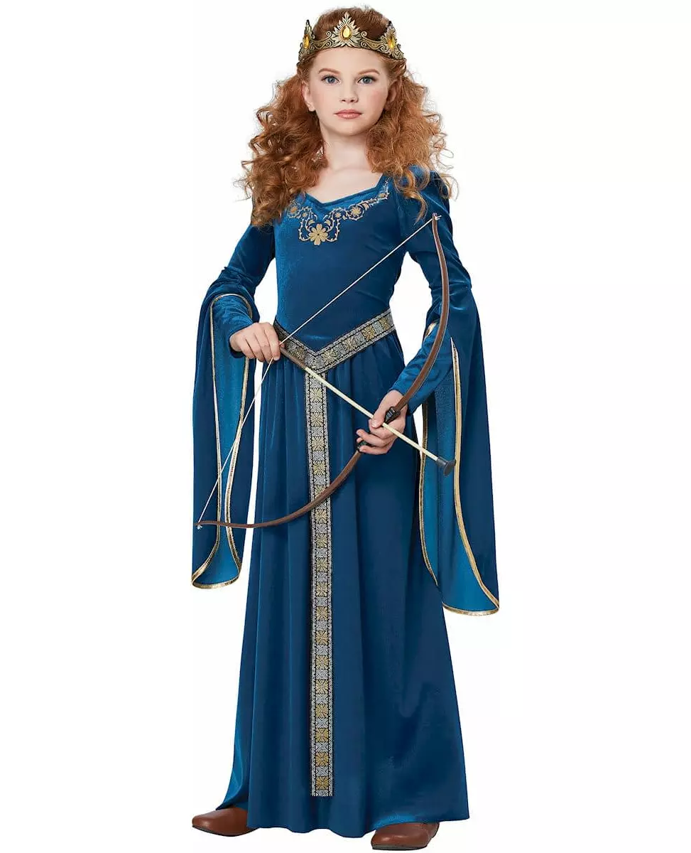 Forvandle datteren din til en opprørsk prinsesse! Dette middelalderprinsessekostymet for jenter består av en kjole, et belte og et hodeplagg (pil og bue ikke inkludert). Prinsessekjolen er mørkeblå, i et fløyelslignende stoff. De lange ermene er vide og åpne på underarmene. Gullmønstre fremhever kjolens halsutringning. Beltet er svart med gull- og hvite mønstre. Det faller foran på kjolen. Hodeplagget forestiller en krone med falske oransje steiner. Dette komplette kostymet vil være perfekt for datteren din for å sette seg inn i skoene til en opprørsk prinsesse til karnevalet. Inkludert tilbehør: Kjole Belte Hodeplagg Materiale: 100 % polyester Vedlikehold: Håndvask