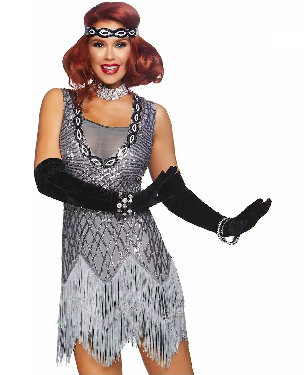 Klar til å lede dansen? Dette Charleston-kostymet vil hjelpe deg. Dette Charleston-kostymet er for kvinner. Det inkluderer en kjole med pannebånd (halsbånd, smykker og hansker er ikke inkludert). Kjolen er paljettbesatt med grå sikksakk-frynser. Halsutringningen er laget av gjennomsiktig stoff. Paljetter vil gi et skinnende preg til denne flotte kjolen. Mønstrene som er sydd på halsutringningen gjentas på pannebåndet. Dette glitrende Charleston-kostymet vil ta deg tilbake til 30-tallet og lar deg vise deg frem på et kostymearrangement. Inkludert tilbehør: Kjolepannebånd Materiale: 100 % polyester Vedlikehold: Håndvask
