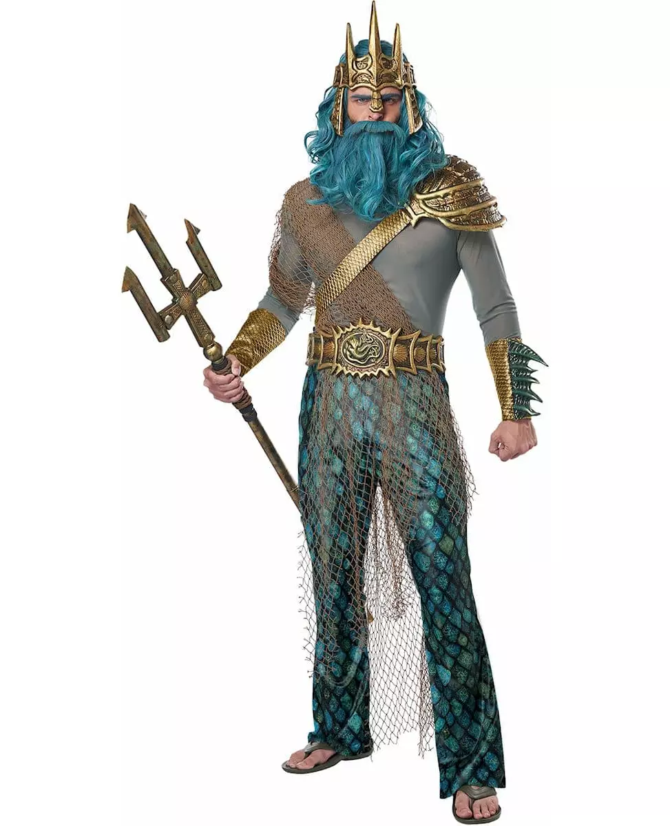 Bli havenes konge med dette havgudkostymet for menn! Dette havgudkostymet er for menn, og det inkluderer topp, krone, belte, skulderbeskytter, rustning, drapert kjole og underarmsbeskyttere (parykk, skjegg, trefork og sko er ikke inkludert). Toppen er grå med lange ermer og et brunt tyllstoff som går over høyre skulder. Ta deretter på deg de skinnende blå buksene som imiterer skjellene til en fisk. Det er over dette du legger til den brune tyllkjolen. Alt du trenger å gjøre er å legge til tilbehøret for å få utseendet til den store Poseidon! Tre på skulderbeskytteren på venstre side av kroppen, beltet, kronen og underarmsbeskytterne for å fullføre antrekket ditt. Dette rustningstilbehøret er gullfarget og har detaljer! Du er klar for din neste olympiske gud-temafest med dette havgudkostymet! Materiale: (Skjorte): 95 % polyester 5 % spandex, (Skulderstropp/mansjetter): 60 % PVC, 30 % polyester, 5 % PU, 5 % metallisk, (Nettdrapering): 100 % nylon. Inkludert tilbehør: Toppkronebelte, skulderbeskytter, kjole, underarmsbeskyttere, pleie: Håndvask