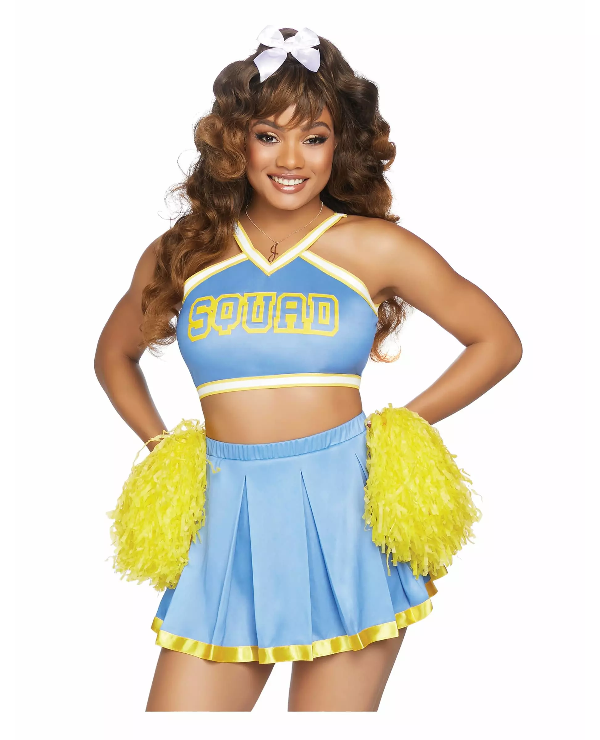 Støtt laget ditt med dette cheerleader-kostymet! Dette blå cheerleader-kostymet er for kvinner. Det inkluderer en crop top, et skjørt og pomponger. Crop-toppen er himmelblå med ordet «SQUAD» skrevet i gult. Kantene er hvite og gullfargede. Det plisserte skjørtet er himmelblått med en gul kant nederst på skjørtet. Et par gule pomponger fullfører dette kostymet. For bedre grep har disse pompongene et lite hvitt håndtak. Dette kostymet vil være perfekt for å være den vakreste cheerleaderen på en temafest. Inkludert tilbehør: Crop top Skjørt Pomponger Materiale: 100 % polyester Vedlikehold: Håndvask