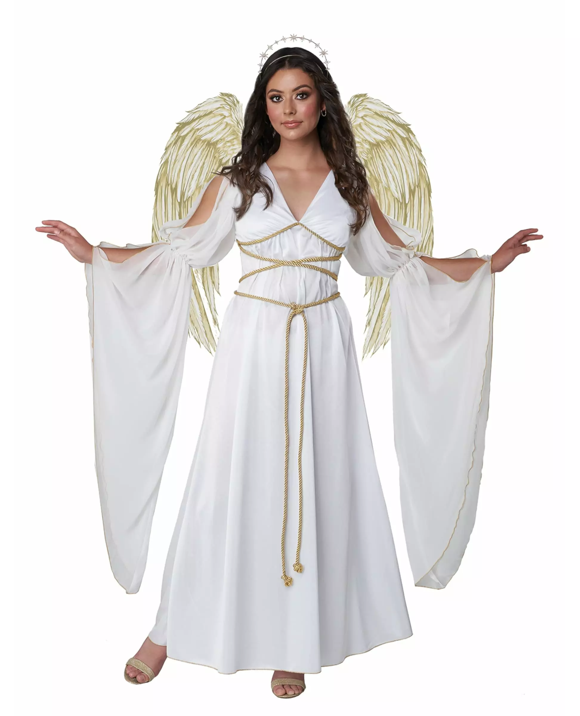 En engel steg ned fra himmelen Dette guddommelige englekostymet er for kvinner. Det inkluderer en kjole, et par vinger og en glorie. Den lange kjolen er hvit med gullsnøring for å knyte rundt livet. Den har ganske lange puffede og utsvingte ermer med et litt gjennomsiktig slørstoff for mer letthet. Vingene er trykket med pene hvite og gullfargede fjær. En pen glorie er også tilstede for å fullføre dette englekostymet. Et kvalitetsenglekostyme for en vellykket kostymefest! Inkludert tilbehør: Kjole 1 par vinger 1 glorie Materiale: 100 % polyester Vedlikehold: Håndvask