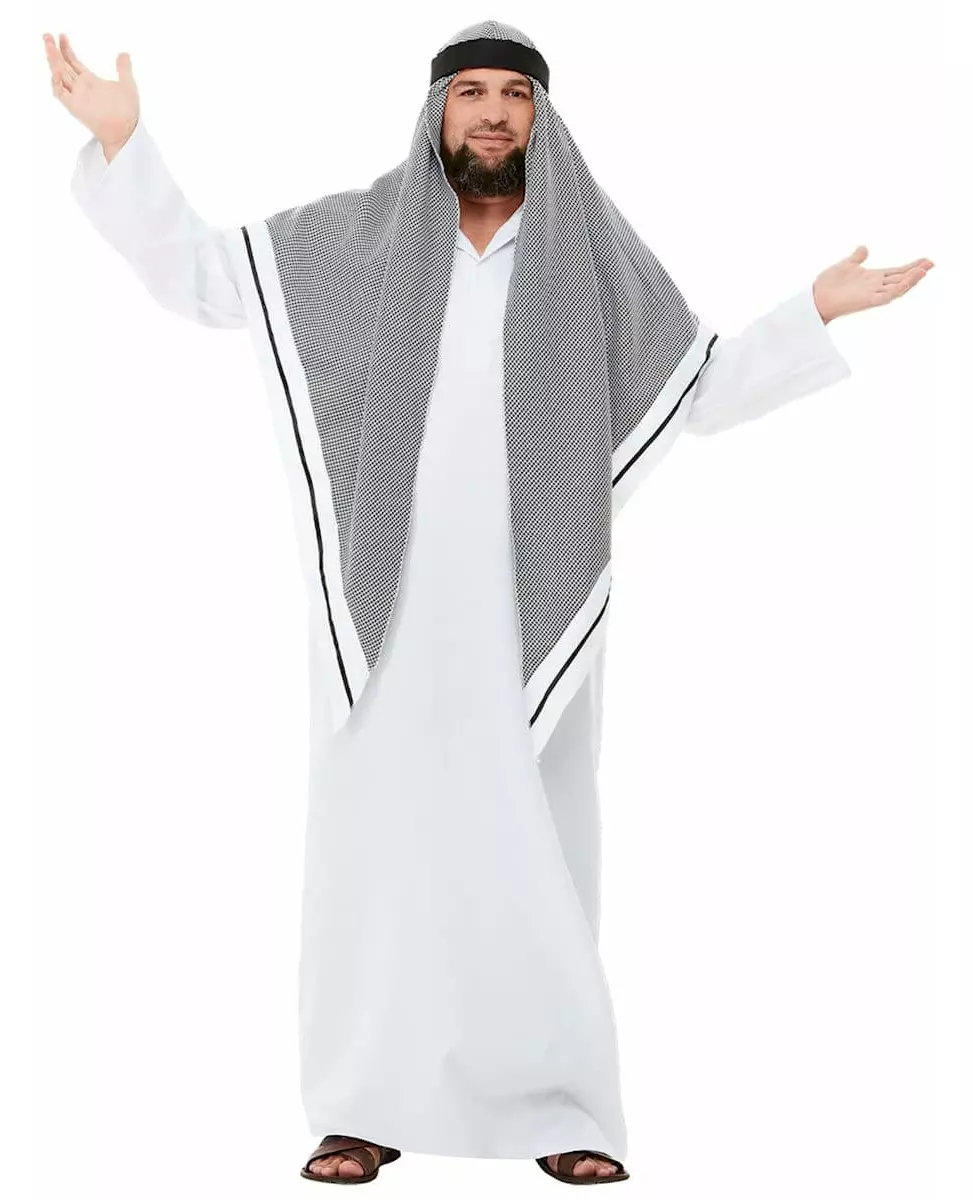 Bli den mest realistiske arabiske prinsen! Dette arabiske sjeik-kostymet er for voksne. Det består av en lang hvit kappe (eller qamis) med lange ermer og et hodeplagg, kalt en keffiyeh, svart og hvitt (sandaler ikke inkludert). Hodeplagget holdes på hodet med et tykt, svart pannebånd. Lev som en prins på ditt orientalsk-tema kostymefest med ditt arabiske sjeik-kostyme!. Inkludert tilbehør: Kjole Hodeplagg Materiale: 100 % polyester