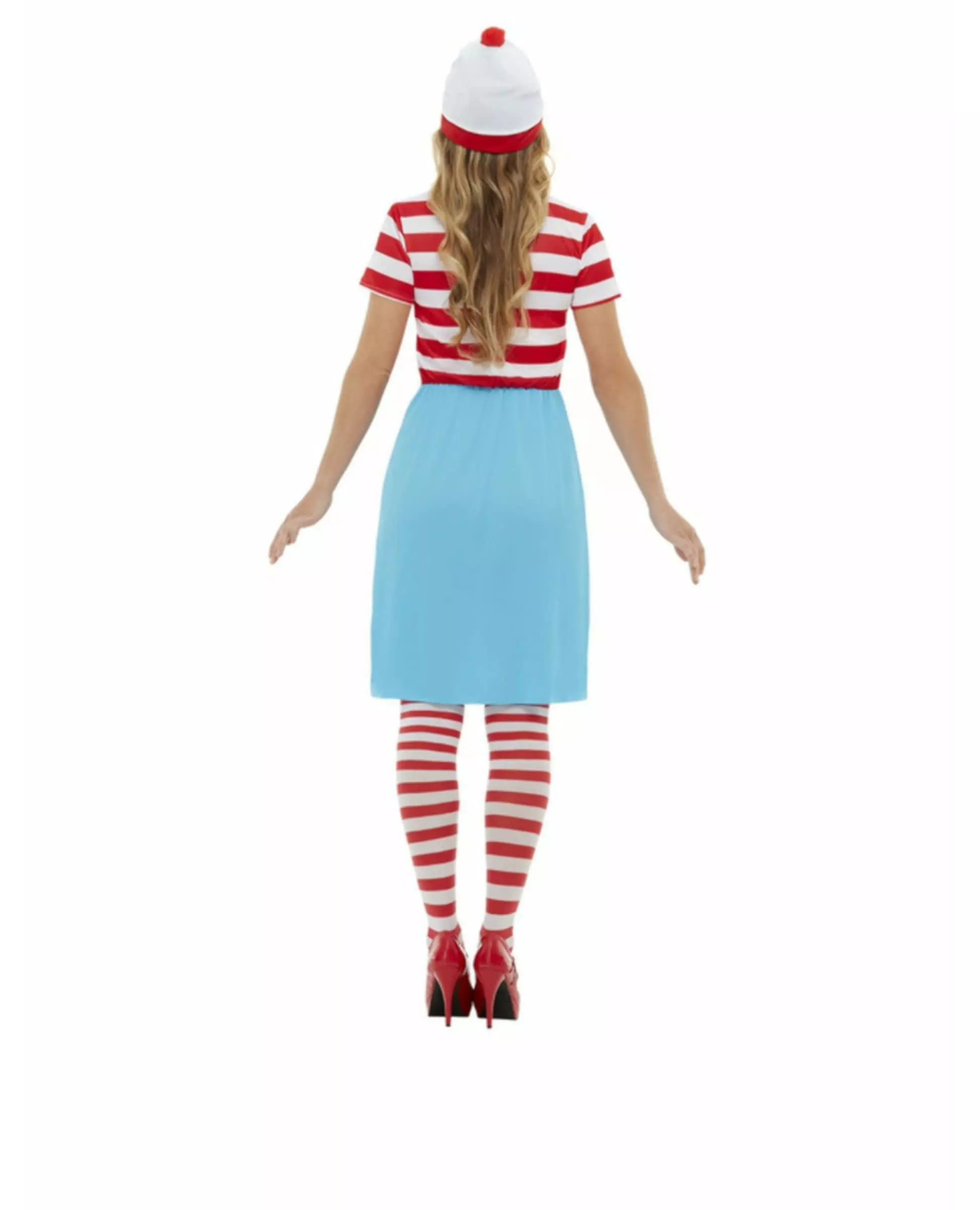 Hvem finner deg i mengden i dette Hvor er Waldo-kostymet? Dette Hvor er Waldo?-kostymet for kvinner består av en kjole, en hatt og et par briller (strømpebukser og sko er ikke inkludert). Overdelen av kjolen er hvit og rødstripet. Underdelen av kjolen er lyseblå. Et brunt belte er sydd i livet. Hatten er hvit med en rød pompong og et rødt bånd nederst. Brillene uten glass er laget av svart plast. De er runde. Dette komplette kostymet vil være perfekt for å legemliggjøre den kvinnelige versjonen av den berømte Charlie på karnevalet. Inkludert tilbehør: Dresshatt Briller Materiale: 100 % polyester Pleie: Håndvask