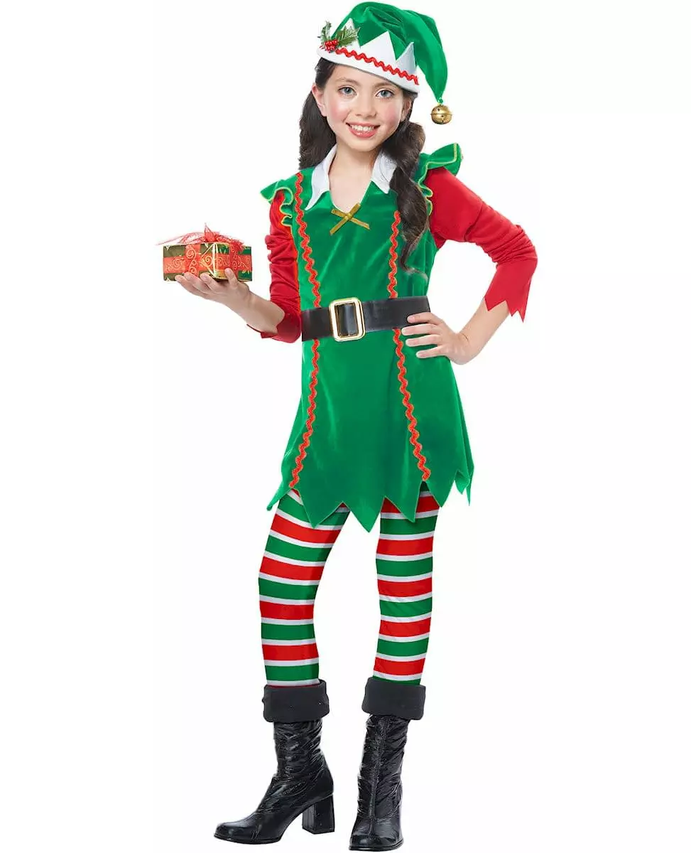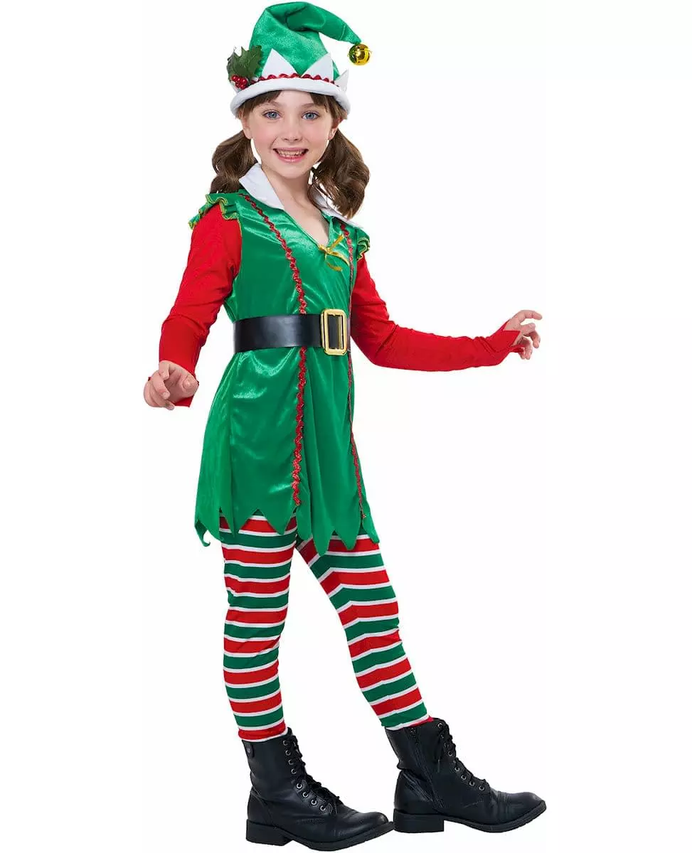 En fargerik alv Dette jule-alvkostymet for jenter består av en tunika, leggings, en lue og et belte (gave og sko er ikke inkludert). Alv-tunikaen er grønn, i et fløyelslignende stoff. Den er dekorert med bølget rød flette. De lange ermene, kuttet i spisser, er røde. Et svart belte fremhever midjen. Den lukkes med en stor gullspenne. Leggingsene har hvite, røde og grønne striper. Til slutt er den spisse hatten i grønt fløyelslignende stoff, med en bjelle i enden. Dette komplette kostymet vil være perfekt for å leke julenissens hjelpere mens man venter på at gaver skal leveres. Inkludert tilbehør: Tunika Lue Belte Leggings Materiale: 100 % polyester Vedlikehold: Håndvask