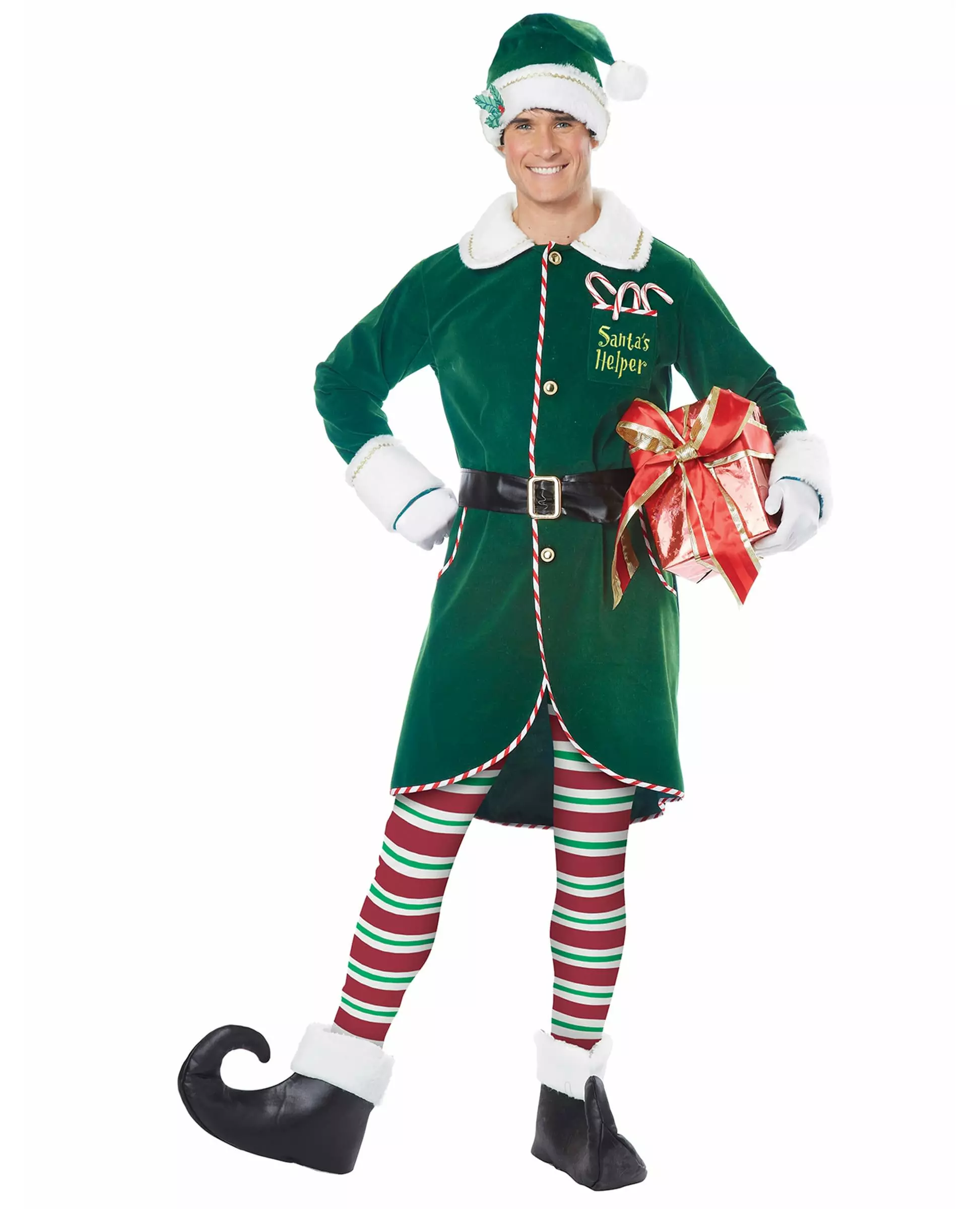Denne julen, forvandle deg til en alv. Dette julenisse-alvkostymet for menn består av en jakke, en lue, et belte, leggings og skoovertrekk (gave og hansker er ikke inkludert). Den mellomlange jakken er grønn, med hvite plysjeffekt-slag. Kneppingen er fremhevet av en rød og hvit stripete flette. Det er en lomme på brysthøyde (godteri er ikke inkludert). Beltet er svart og lukkes med en firkantet gullspenne. Leggingsene er hvite med røde og grønne striper. De spisse skoovertrekkene er svarte, med et hvitt bånd ved anklene. Til slutt er luen grønn og hvit, med et kristtorn på siden. Dette kostymet vil være perfekt for å leke julenissens hjelpere i løpet av slutten av året. Inkludert tilbehør: Jakke Lue Belte Leggings Materiale: 100 % polyester Vedlikehold: Håndvask