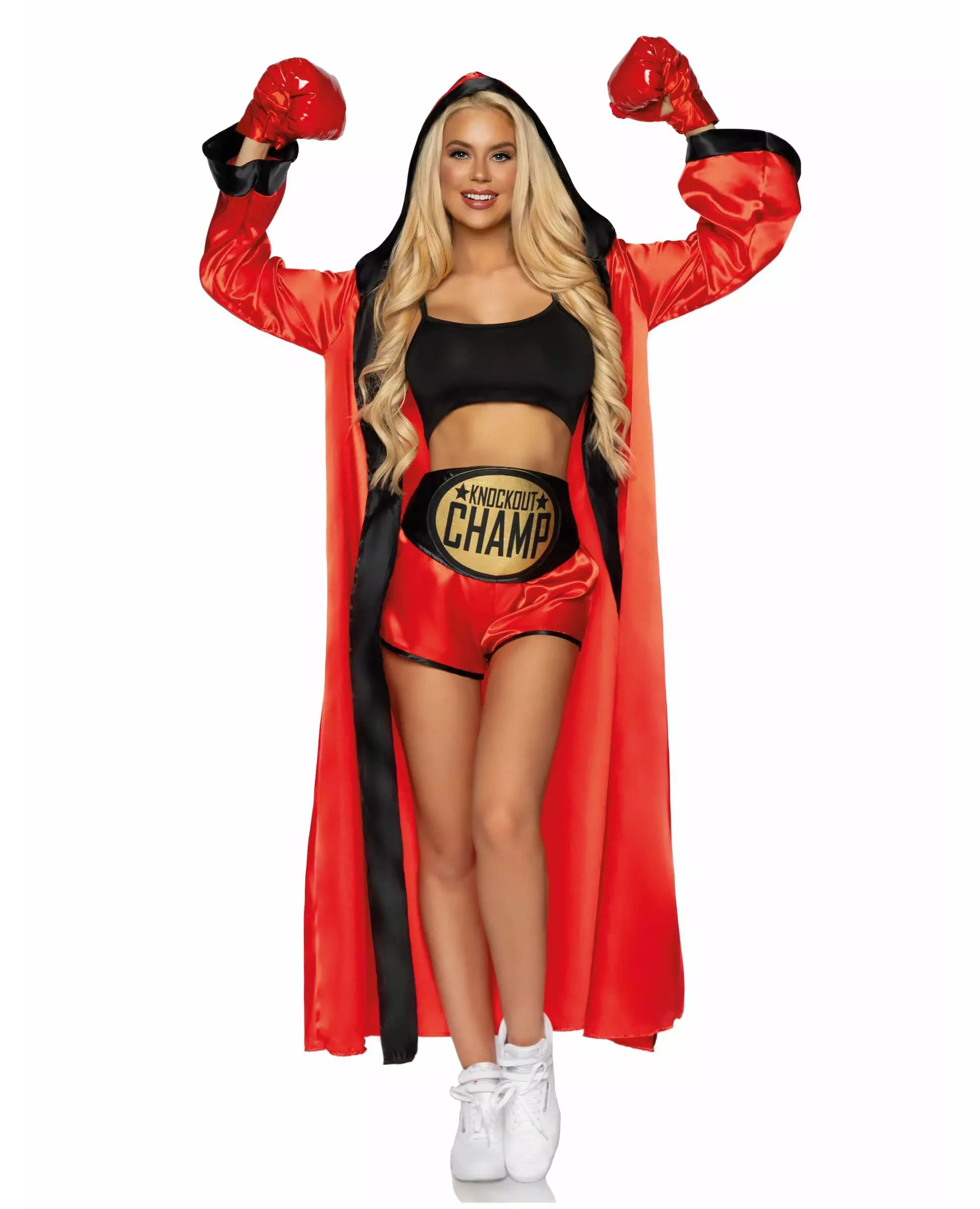 Mesteren i alle kategorier! Dette luksuriøse bokserkostymet for kvinner består av en topp, shorts, et belte, et par hansker og en badekåpe. Toppen er en kort svart tanktopp. De korte shortsene er laget av rødt satengstoff med en svart kant nederst. En pen rød satengbadekåpe med svart kant og en stor hette fullfører antrekket for enda mer sjarm og realisme. Et bredt svart og gullfarget boksemesterbelte er inkludert. Hanskene er lakkerte og røde, noe som fullfører dette høykvalitetskostymet perfekt. Med dette luksuriøse bokserkostymet kan du bli en ringstjerne på en sports- eller uniformfest. Materiale: ukjent. Inkludert tilbehør: Topp, shorts, boksekåpe, belte, 2 hansker