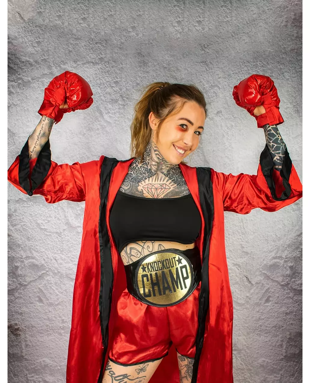Mesteren i alle kategorier! Dette luksuriøse bokserkostymet for kvinner består av en topp, shorts, et belte, et par hansker og en badekåpe. Toppen er en kort svart tanktopp. De korte shortsene er laget av rødt satengstoff med en svart kant nederst. En pen rød satengbadekåpe med svart kant og en stor hette fullfører antrekket for enda mer sjarm og realisme. Et bredt svart og gullfarget boksemesterbelte er inkludert. Hanskene er lakkerte og røde, noe som fullfører dette høykvalitetskostymet perfekt. Med dette luksuriøse bokserkostymet kan du bli en ringstjerne på en sports- eller uniformfest. Materiale: ukjent. Inkludert tilbehør: Topp, shorts, boksekåpe, belte, 2 hansker