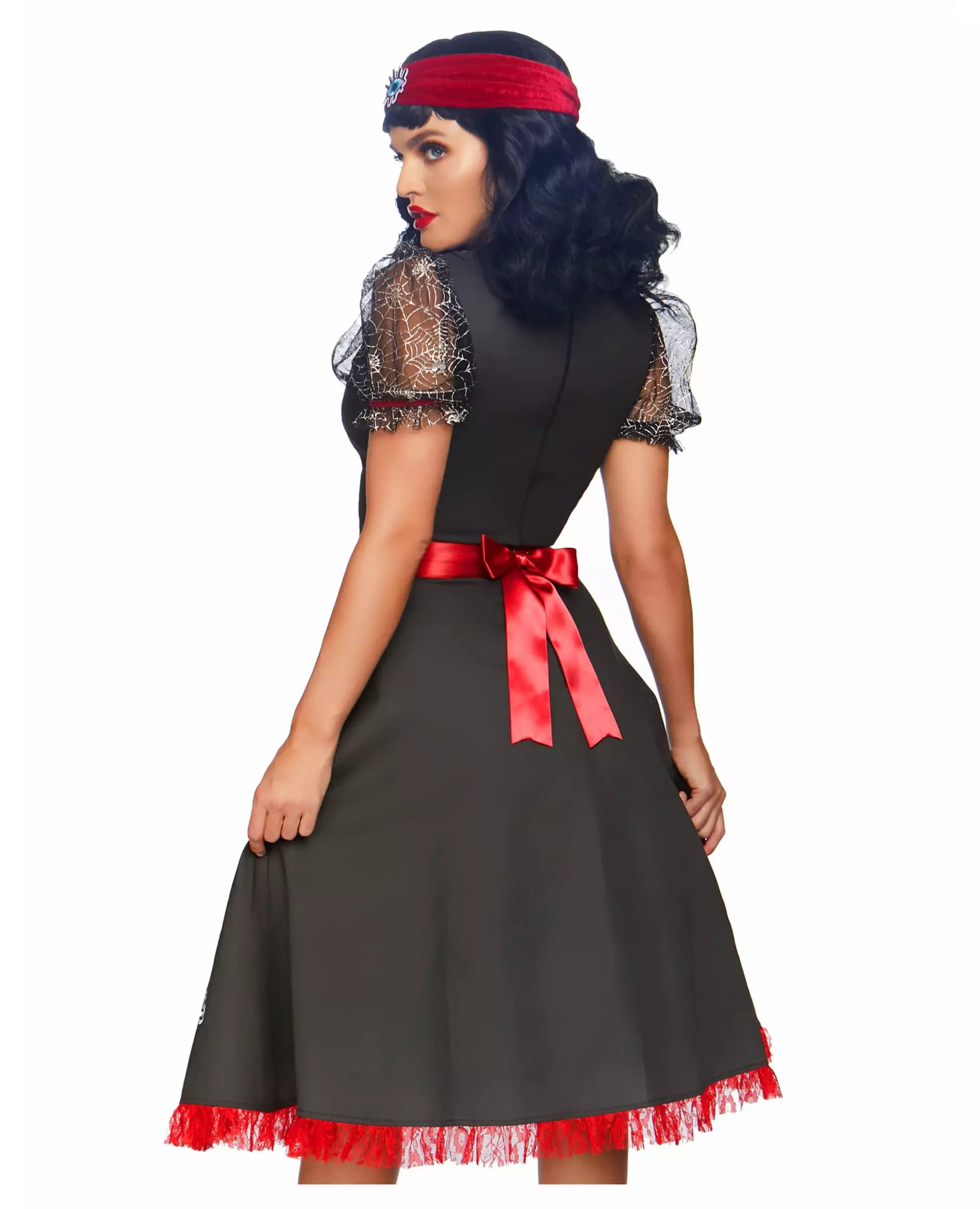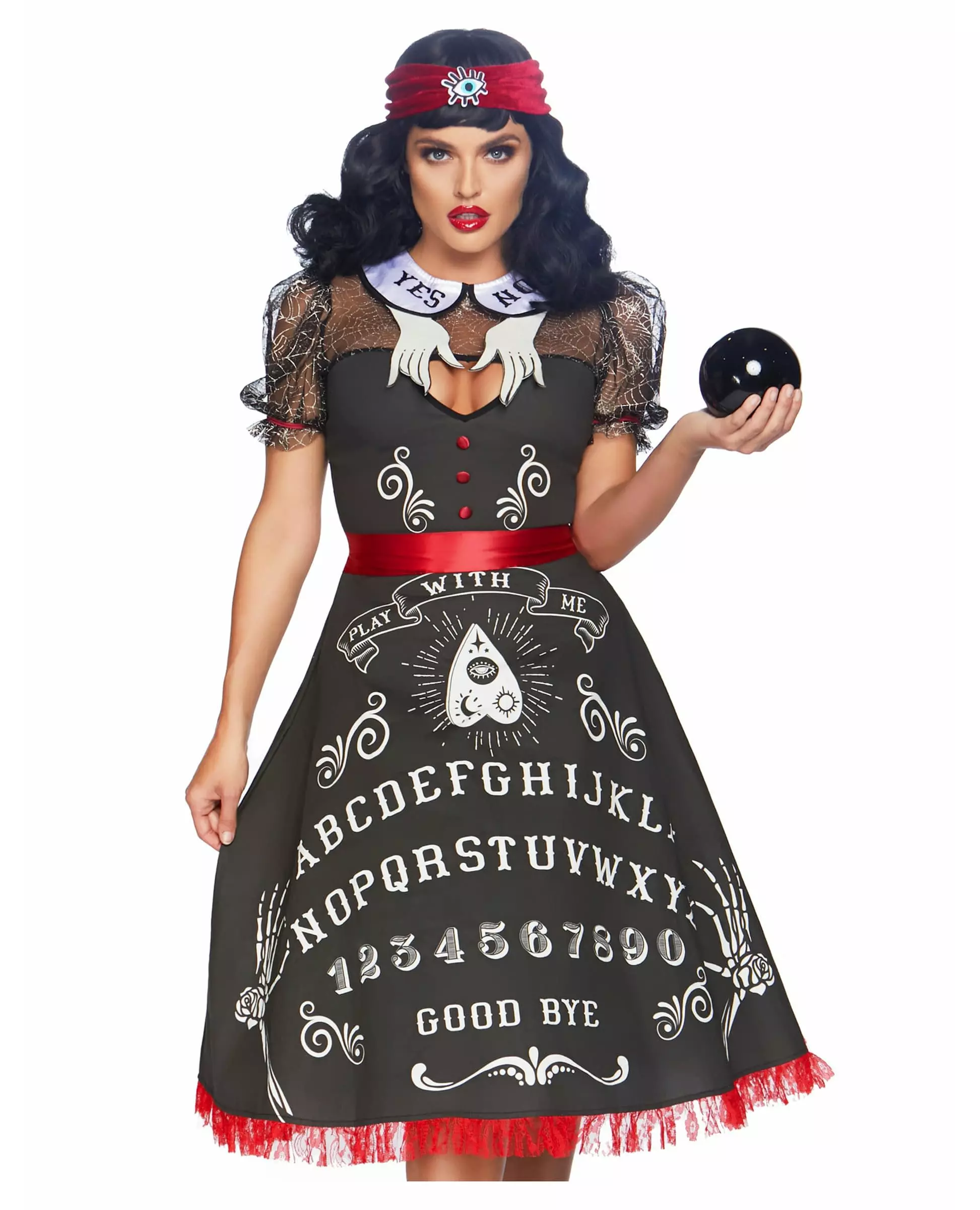 La denne spåkonen forutsi fremtiden din! Dette spåkonekostymet er for kvinner. Det består av en kjole, et belte og et pannebånd (krystallkule og parykk er ikke inkludert). Denne kjolen av høy kvalitet har Ouija-bretttrykk. I livet er det et rødt knytebånd bak som fremhever figuren din. Peter Pan-kragen er hvit med ordene «Ja» og «Nei» på hver side. To håndavtrykk er tilstede i brysthøyde. Et gjennomsiktig svart slør med spindelvevmønstre dekker skuldrene. En stripe med rød tyll tegner bunnen av kjolen. Pannebåndet er rødt med et øye på, som relaterer seg til klarsyn. Dette kostymet vil være perfekt for å sette deg i skoene til en spåkone til for eksempel Halloween. Inkludert tilbehør: Kjole Belte Pannebånd Materiale: 100 % polyester Stell: Håndvask