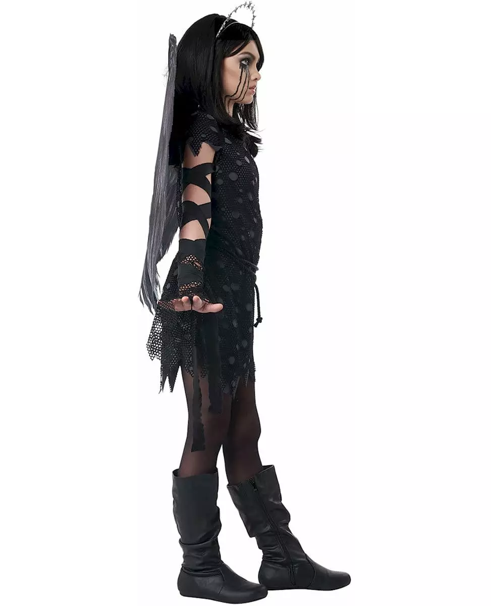 En gotisk engel til Halloween! Dette gotiske engelkostymet er for barn og består av en kjole, et belte, mansjetter, snøring, vinger og en glorie. Kjolen er helt svart og har korte ermer. Den er dekket med et fillete svart stoff. Det svarte taubeltet knytes rundt livet. De to svarte snøringene vil pynte armene, mens de fillete mansjettene vil gi en gotisk effekt. Vingene er svarte og har strikk for å holde dem enkelt på plass. Antrekket fullføres av glorien montert på et pannebånd. Dette gotiske engelkostymet vil være perfekt til Halloween! Inkludert tilbehør: Kjole Vinger Glorie Mansjetter Snøring Belte Materiale: 100 % polyester Vedlikehold: Håndvask