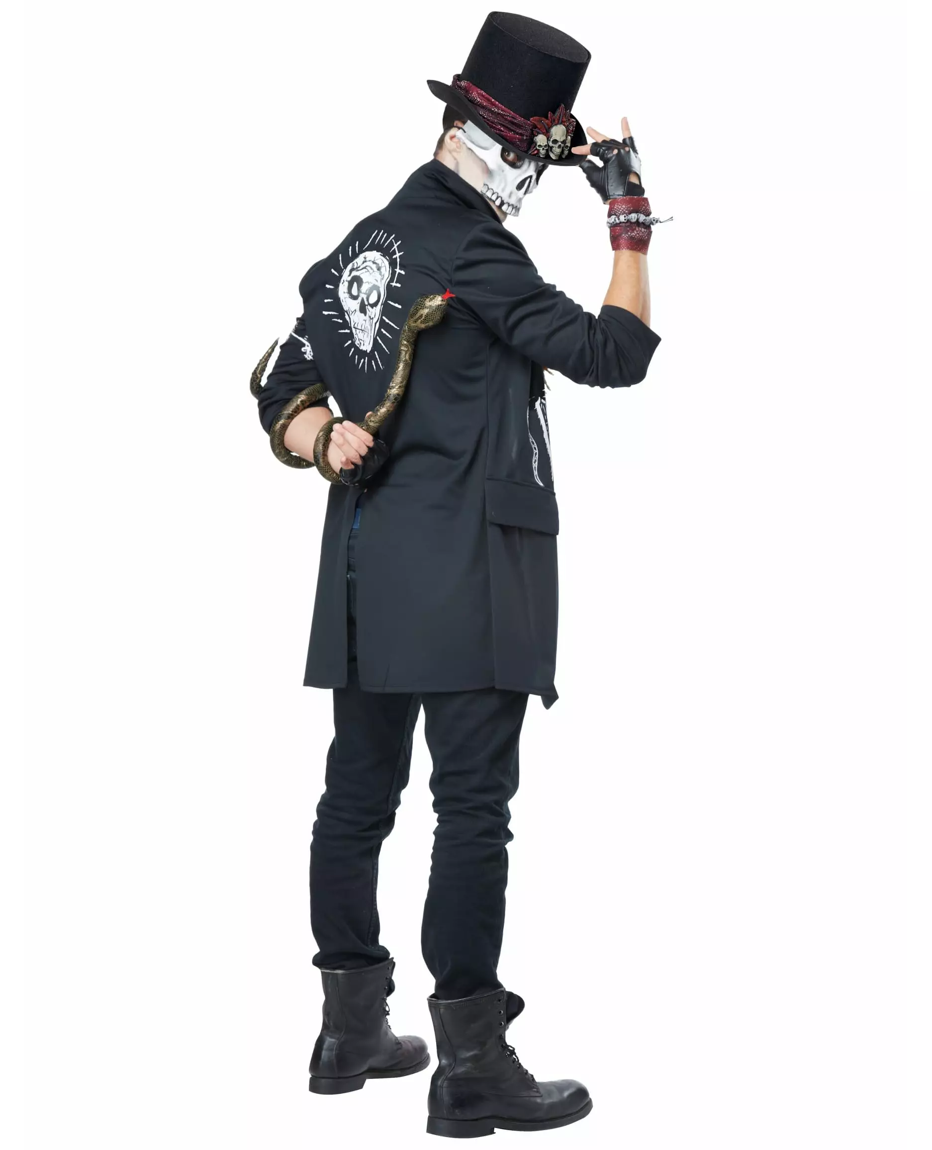 Få et voodoo-utseende til Halloween. Dette voodoo-kostymet for voksne består av en jakke med vest, en hatt og en maske. Den lange jakken er svart med voodoo-motiver: nålet dukke, hodeskalle osv. En rød vest er festet direkte til jakken. Det vil gi et elegant preg til dette kostymet. Hatten er en svart flosshatt. Basen er dekorert med et rødt bånd. På forsiden er tre hodeskaller med onde smil omgitt av svarte og røde mønstre. Halvmasken representerer en hodeskalle. Den skjuler ikke haken eller bakhodet. Det er åpninger for øynene. Dette kvalitetskostymet vil umiddelbart forvandle deg til en voodoo-mester til Halloween eller karneval. Inkludert tilbehør: Jakke med vest Hatt Maske Materiale: 100 % polyester Vedlikehold: Håndvask.