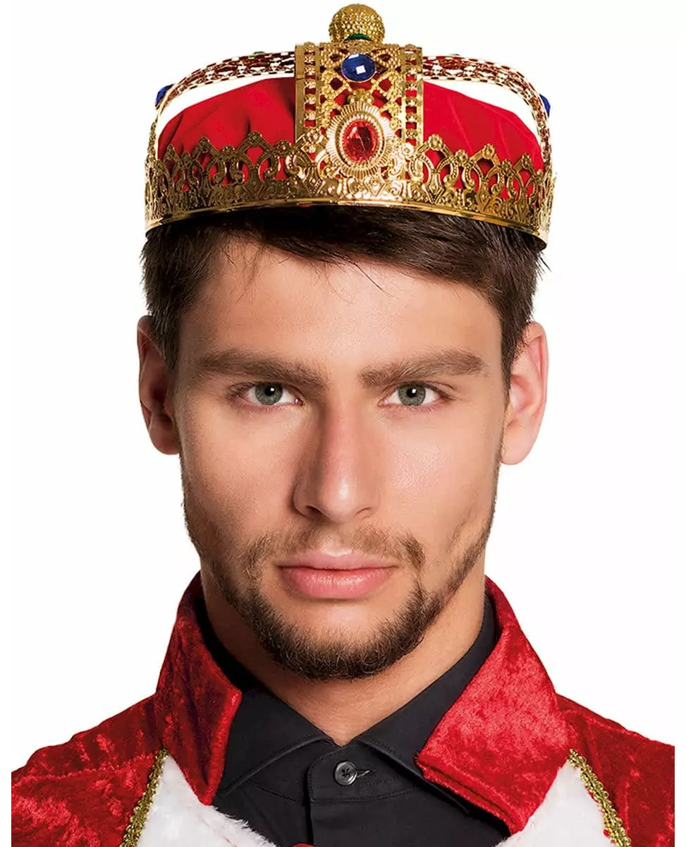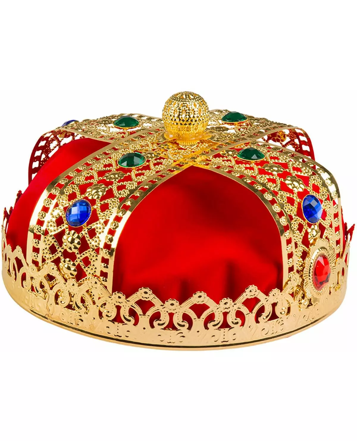 En kongekrone! Denne luksuriøse kongekronen er for voksne. Den er laget av fint gullfarget metall. Den har et burgunderfarget fløyelseffektstoff under kronen. Den har grønne, røde og blå kunstige juveler. Denne kongekronen vil være perfekt for å fullføre kongekostymet ditt. Inkludert tilbehør: 1 krone