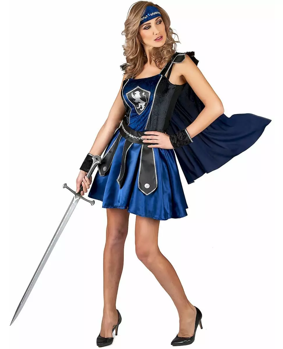 Tapper! Dette ridderkostymet for kvinner inkluderer en kjole, et belte, et pannebånd og to ermer (skjold og sverd er ikke inkludert). Den korte, tettsittende kjolen består av en fløyelsbustier-del med et sølvfarget løvevåpenskjold og en blå satengskjørtdel. De brede stroppene er dekorert med myke skulderstropper med sølvkant. Ryggen din vil være kledd i en marineblå kappe laget av mykt stoff som vil følge hver eneste bevegelse du gjør. Beltet, som skal knytes på ryggen og er laget av tykt, skinnende stoff, har 3 brede stropper med sølvfinish. Det blå fløyelshodeplagget med edelsten, som matcher kostymet, vil passe alle hodestørrelser takket være strikken som er sydd på ryggen. Til slutt kan de to svarte fløyelsermene borrelåsfestes rundt håndleddene. Tips: For mer volum i skjørtet anbefaler vi å bruke et underskjørt (ikke inkludert). På en kostymefest med venner vil du definitivt være den mest sexy i dette middelalderske ridderkostymet. Inkludert tilbehør: Kjole med kappe Beltepannebånd 2 mansjetter Materiale: 100 % polyester Stell: Håndvaskbar Målinformasjon: For en størrelse S, kjole ca. 90 cm lang