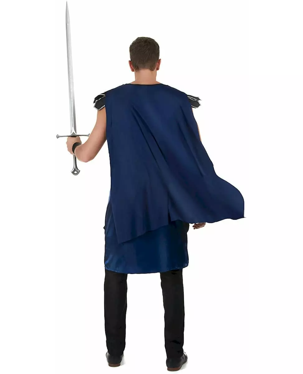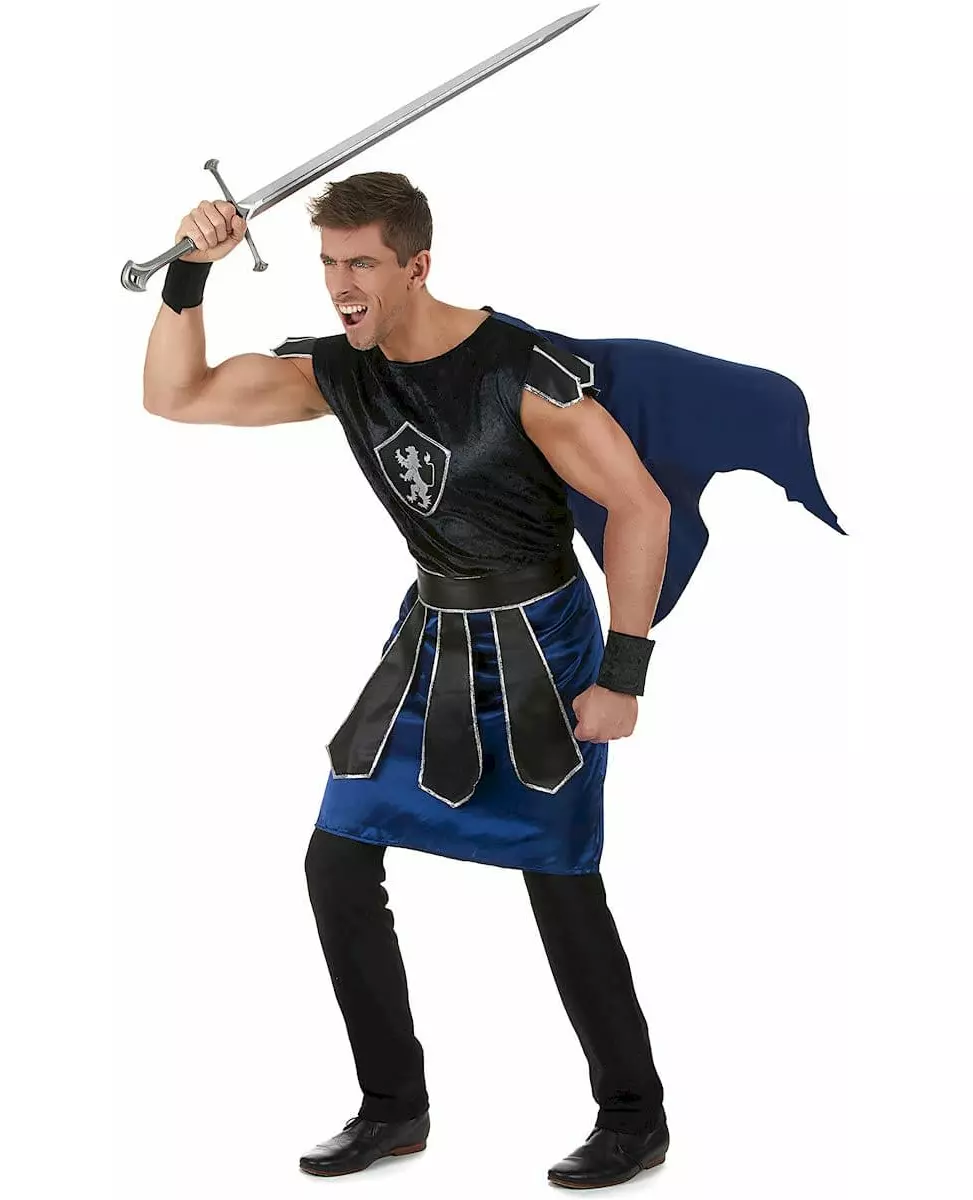 Styrke og tapperhet Dette ridderkostymet for menn inkluderer en tunika, et belte og et par mansjetter (sverd, bukser og sko er ikke inkludert). Tunikaen er laget av svart fløyel kun foran på bysten (stoffet er ensfarget svart bak). Et vakkert svart våpenskjold med en sølvløve er på overkroppen. Skjørtdelen er laget av marineblått satengstoff. Fargen på kappen, som er sydd til skuldrene, er den samme som skjørtet (stoffet er matt og smidig). Skuldrene er dekorert med satengsvarte filtstrimler og sølvkanter. Beltet knytes bak og vil markere midjen din. Det representerer et rustningsskjørt med anheng som minner om dekorasjonene på skuldrene. Til slutt er borrelåsmansjettene svarte og også i fløyel. Dette kvalitetskostymet vil være perfekt for å spille den tapre løveridderen på en kostymefest eller til et show!. Inkludert tilbehør: Tunika med kappe 2 mansjetter Beltemateriale: 100 % polyester Vedlikehold: Håndvaskbar
