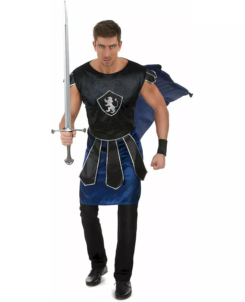 Styrke og tapperhet Dette ridderkostymet for menn inkluderer en tunika, et belte og et par mansjetter (sverd, bukser og sko er ikke inkludert). Tunikaen er laget av svart fløyel kun foran på bysten (stoffet er ensfarget svart bak). Et vakkert svart våpenskjold med en sølvløve er på overkroppen. Skjørtdelen er laget av marineblått satengstoff. Fargen på kappen, som er sydd til skuldrene, er den samme som skjørtet (stoffet er matt og smidig). Skuldrene er dekorert med satengsvarte filtstrimler og sølvkanter. Beltet knytes bak og vil markere midjen din. Det representerer et rustningsskjørt med anheng som minner om dekorasjonene på skuldrene. Til slutt er borrelåsmansjettene svarte og også i fløyel. Dette kvalitetskostymet vil være perfekt for å spille den tapre løveridderen på en kostymefest eller til et show!. Inkludert tilbehør: Tunika med kappe 2 mansjetter Beltemateriale: 100 % polyester Vedlikehold: Håndvaskbar