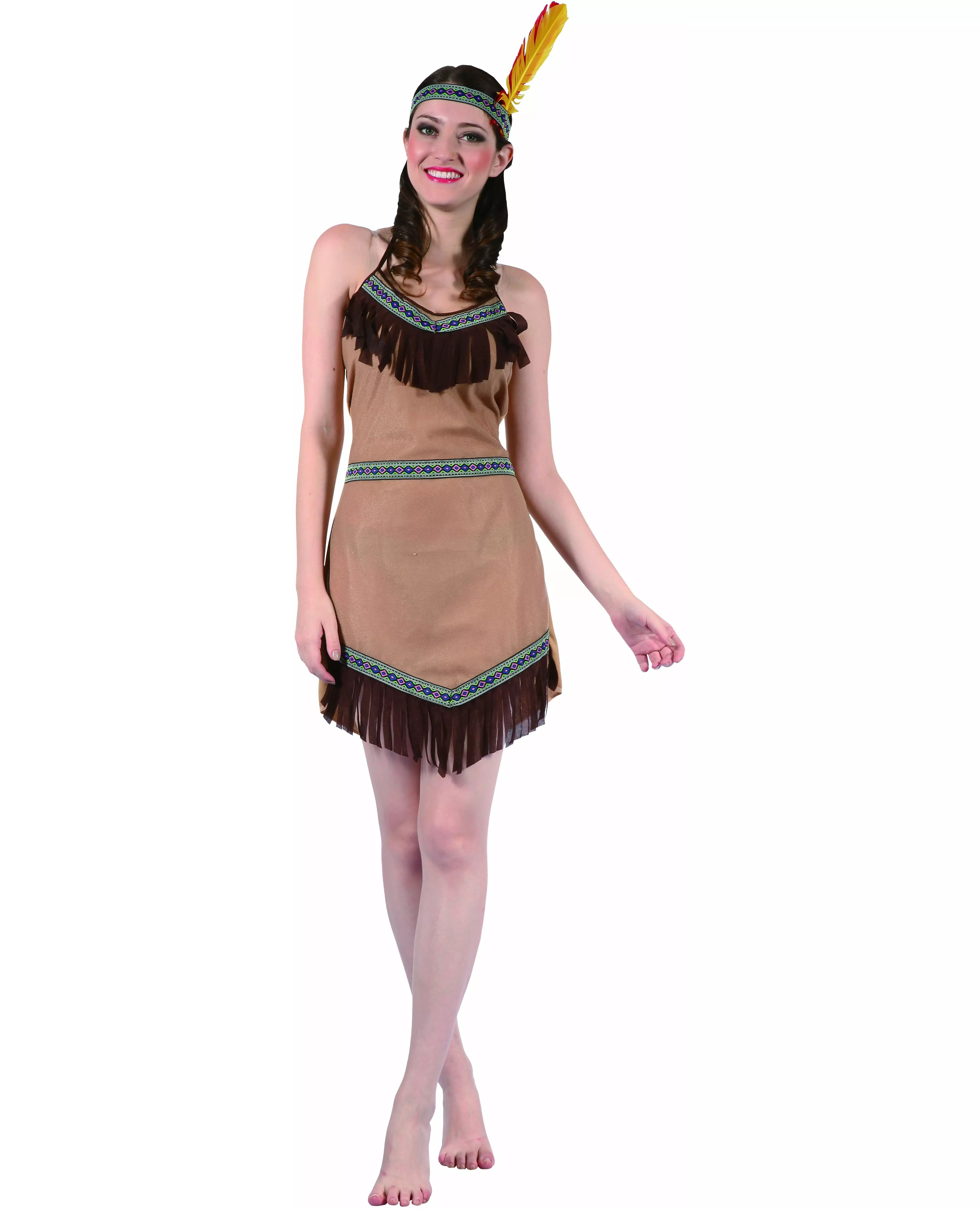 Av gårde til Ville Vesten! Dette indianerkostymet for kvinner består av en kjole og et hodeplagg. Kjolen med frynser er brun og har lyseblå detaljer. Et matchende pannebånd med fjær er også inkludert. Dette indianerkostymet vil være perfekt for å transportere deg til Ville Vesten for en westernkveld. Inkludert tilbehør: Kjolepannebånd