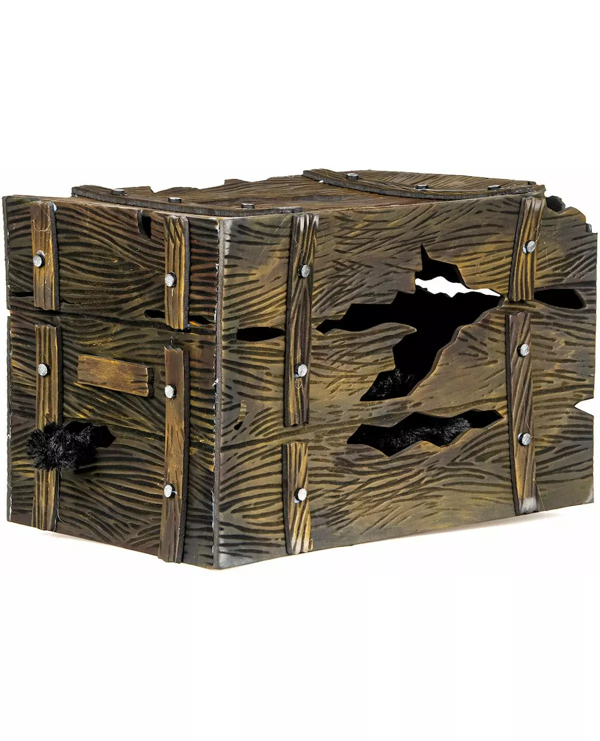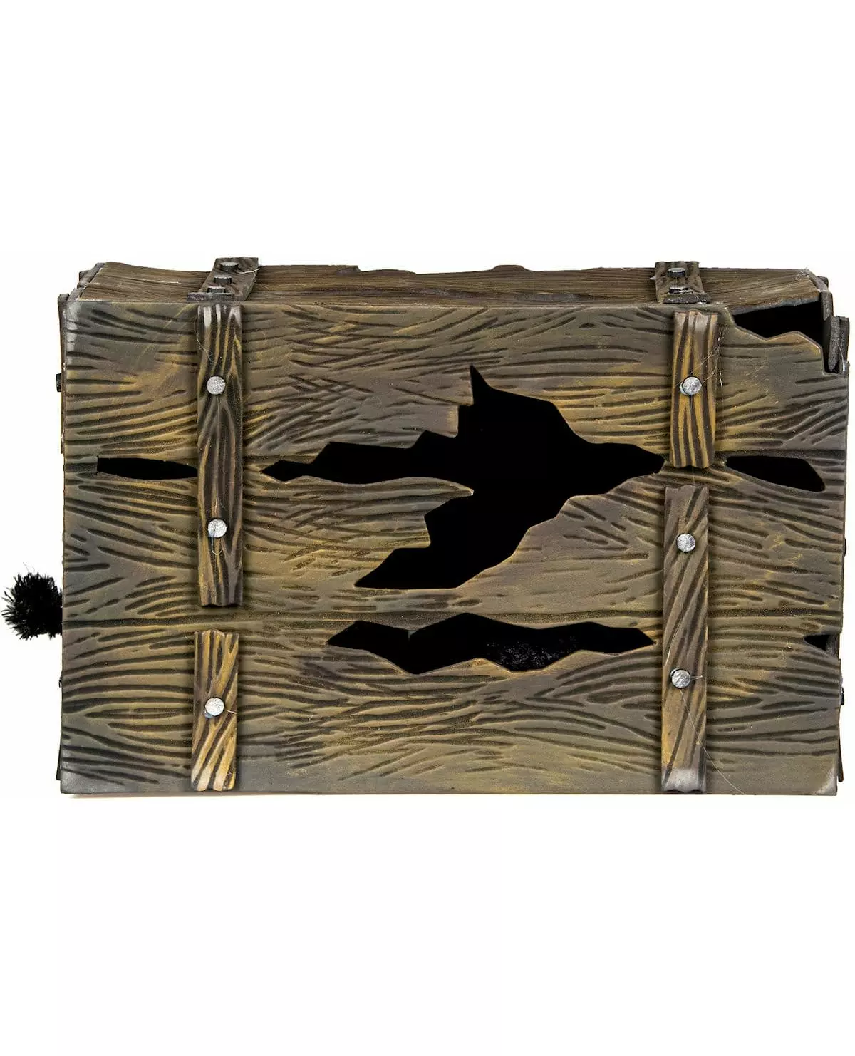 En kiste med en skjult skapning! Denne lys- og lydkisten måler omtrent 46 x 30 cm. Den har åpninger på sidene, slik at du kan prøve å få et glimt av skapningen som gjemmer seg inni. Når den er slått på, vil skapningen begynne å banke på innsiden av kisten for å komme seg ut, og avgi skumle lyder og et rødt lys. Denne kisten vil være perfekt som en skrekkdekorasjon under Halloween eller til en piratfest. Inkludert tilbehør: 1 kiste
