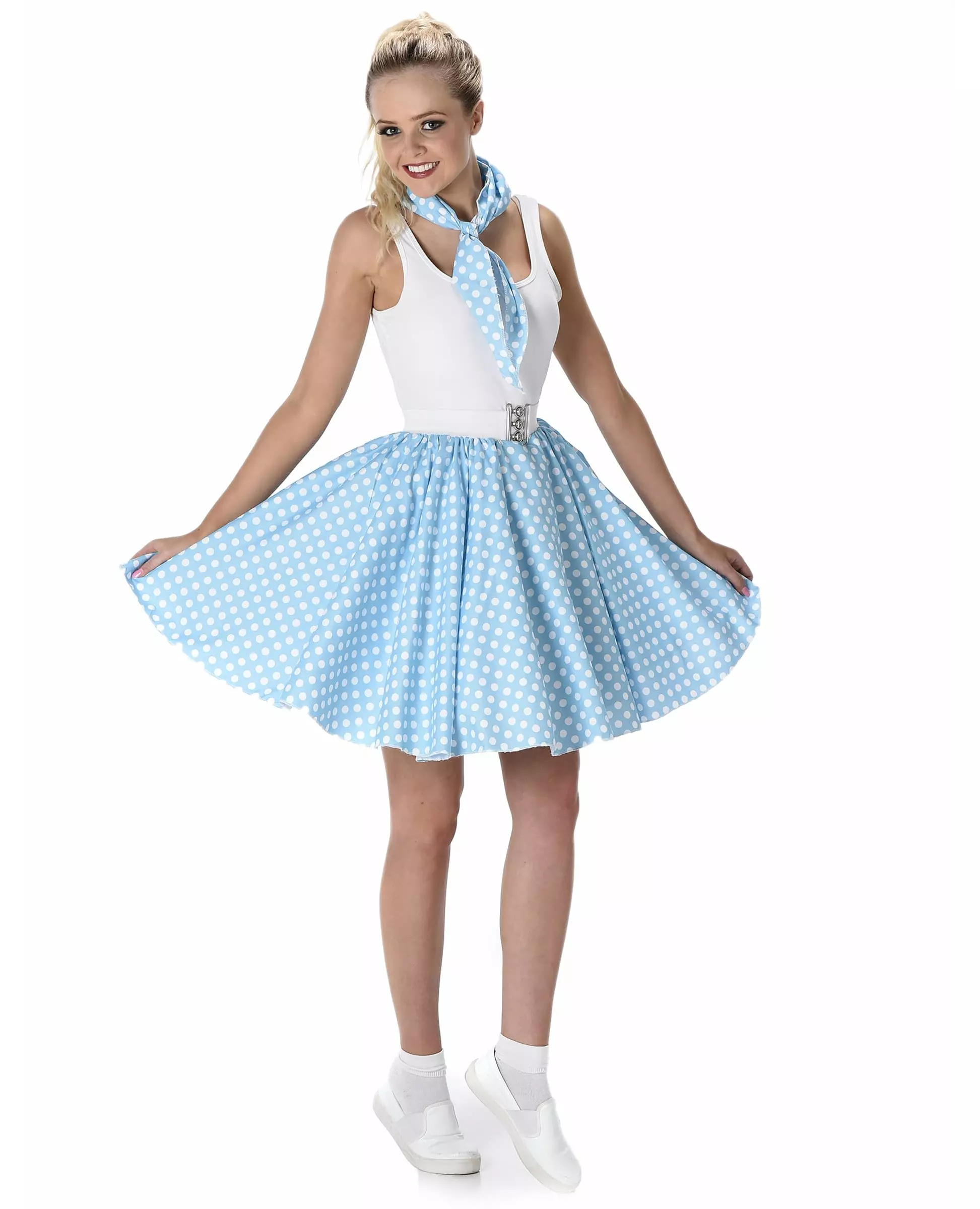 Vintage-fan? Dette settet er for deg! Dette 50-tallskostymet for kvinner inkluderer et skjørt med belte og en bandana (topp, sokker og sko er ikke inkludert). Det puffede skjørtet er blått med hvite prikker og måler 53 cm i lengden. Skjørtet er fôret og har elastikk i linningen for å tilpasse seg alle kroppsformer. Et hvitt belte vil bli sydd fast på skjørtet. Bandanaen som matcher skjørtet er tilbehøret som vil gjøre forskjellen og gi et elegant preg. Dette settet vil være perfekt for å lage et 50-talls kostyme til en retrofest. Inkludert tilbehør: Skjørt Skjerf Materiale: 100 % polyester Vedlikehold: Håndvask