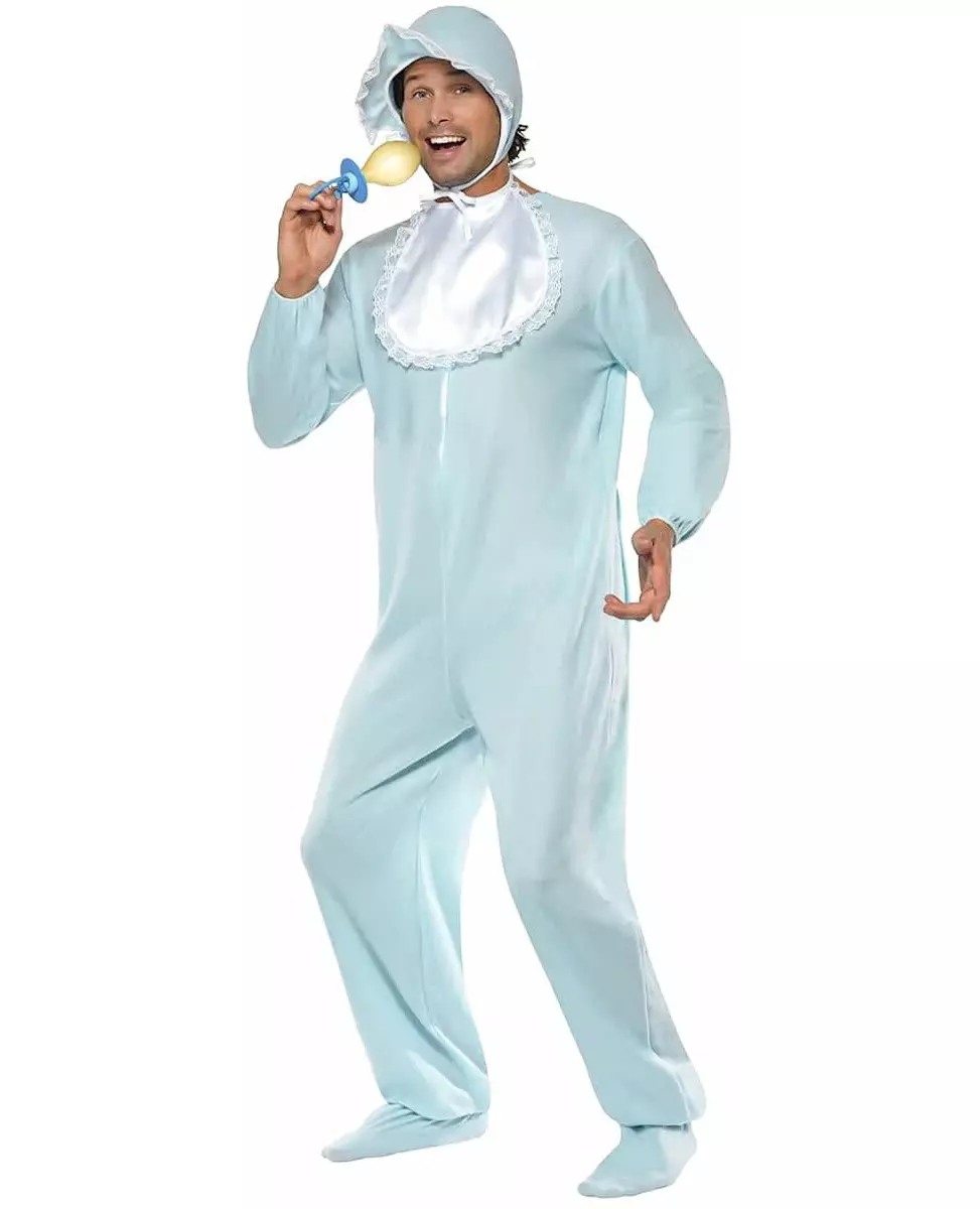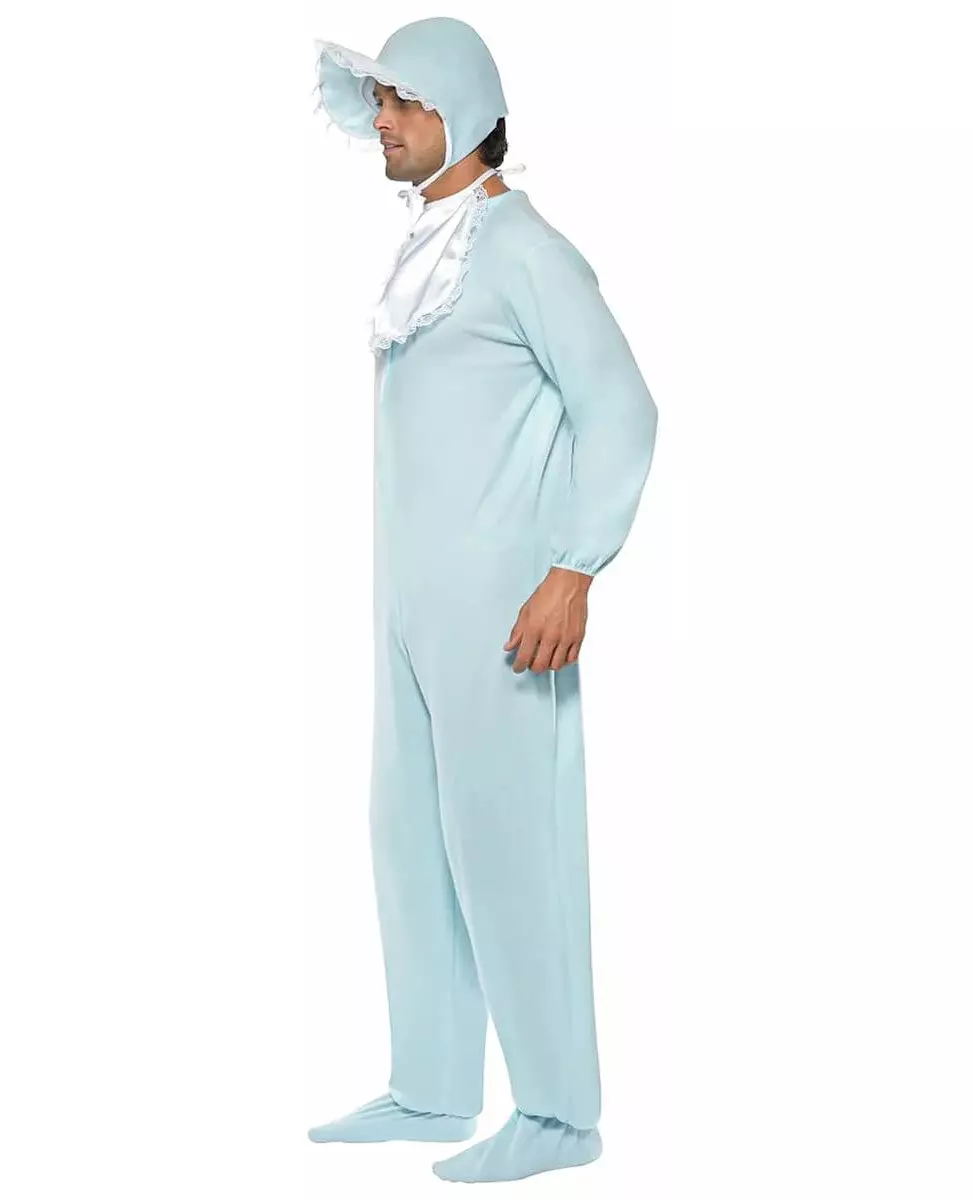En ekte babypysjamas! Morsomt babykostyme for menn i voksenstørrelse i pastellblått, for et ekstravagant utseende. Et morsomt kostyme for å forvandle deg selv og ta på seg utseendet til en baby i en sparkedrakt på et blunk. Kostyme bestående av en jumpsuit med en matchende hatt. Et perfekt kostyme for vellykkede kostymefester. Inkludert tilbehør: Jumpsuit, hatt, smekke. Materiale: 100 % polyester. Vedlikehold: Håndvask.