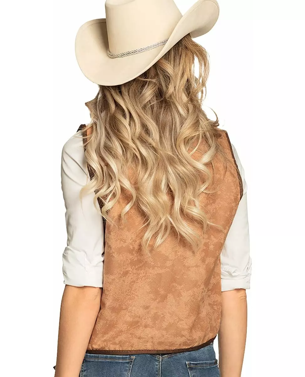 Fullfør cowgirl-antrekket ditt med denne vesten. Denne cowgirl-jakken er for kvinner (kun jakken er inkludert). Den er lysebrun, med frynser på brystet og helt nederst. Et dyretrykk er også på skuldrene. Denne vesten vil være perfekt for å fullføre et cowboykostyme til karneval eller en kveld med western-tema. Inkludert tilbehør: Vest Materiale: 100 % polyester Pleie: Håndvask