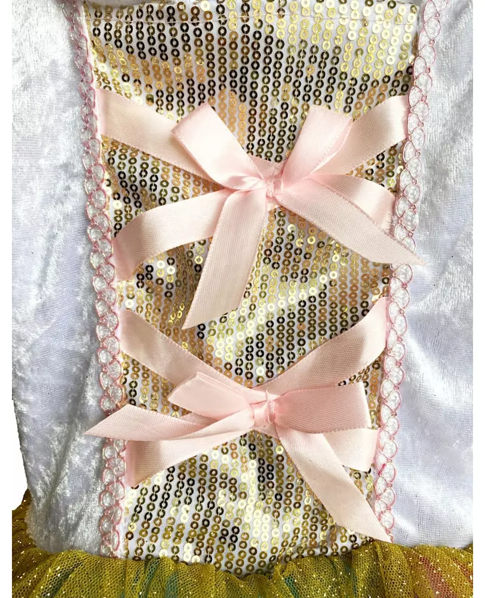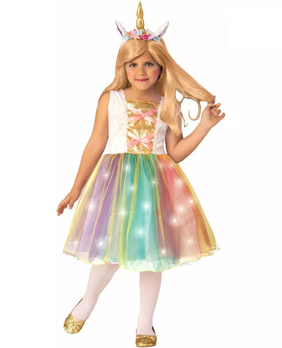 En magisk drøm i regnbuens farger! Dette lysende enhjørningsprinsessekostymet for barn fordyper barnet ditt i en magisk verden. Den skimrende kjolen, i pastellfarger og gulldetaljer, forsterkes av et flerfarget underskjørt som våkner til liv med lys så snart det aktiveres. Lyssystemet, diskret integrert i underskjørtet, lyser opp automatisk takket være en skjult aktiveringsknapp. De blinkende LED-lysene gir en glitrende effekt med hvert trinn. Krever 3 LR44-batterier (inkludert), for umiddelbar belysning. Et perfekt kostyme for å skinne på en bursdag, karneval eller en fefest. Materiale: Tekstil. Inkludert tilbehør: Blinkende LED-kjole