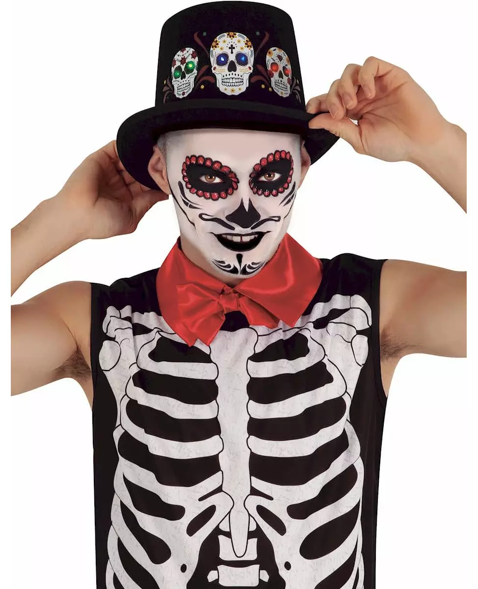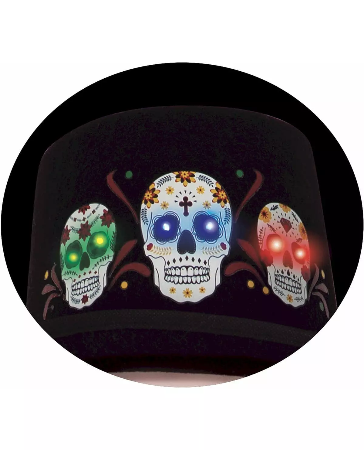 En original lysende hatt til Halloween! Denne lysende hatten er for voksne (topp, sløyfe og sminke er ikke inkludert). Denne svarte filtflosshatten har en "prøv meg"-knapp. Denne knappen lar deg lyse opp øynene til skjelettene som er trykt på hatten. Batterier til dette produktet er inkludert i settet. Denne hatten vil være perfekt for å fullføre Dia de los muertos-kostymet ditt til Halloween! Materiale: Stoff, filt. Inkludert tilbehør: Hatt med 6 LED-lys. Pleie: Håndvask.
