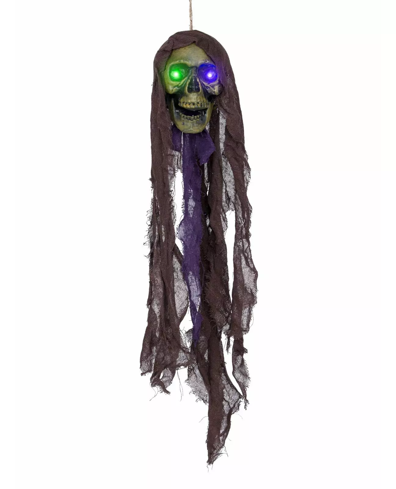 Foruroligende, ikke sant? Her er et flott skjeletthode med refleksjoner som minner om slitt kobber. Med sine revne gardiner og vidåpne kjeve vil det garantert skremme mer enn én person. Pluss? Med 3 LR44-knappbatterier (ikke inkludert) vil dekorasjonen blinke med øyne i alle farger. Et skue som kan skremme mer enn én person hvis dekorasjonen er i hagen midt på natten. På Halloween-kvelden kan du la fantasien løpe løpsk for å lage en skremmende dekorasjon som vil få vennene dine til å grøsse! Inkludert tilbehør: Hengende dekorasjon Materiale: Plast og polyester